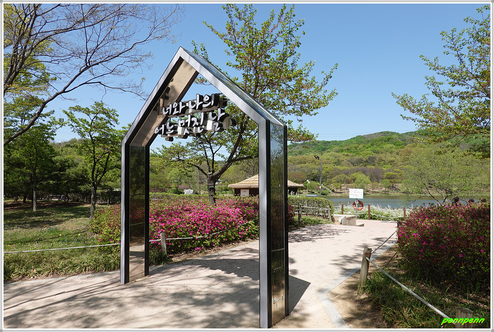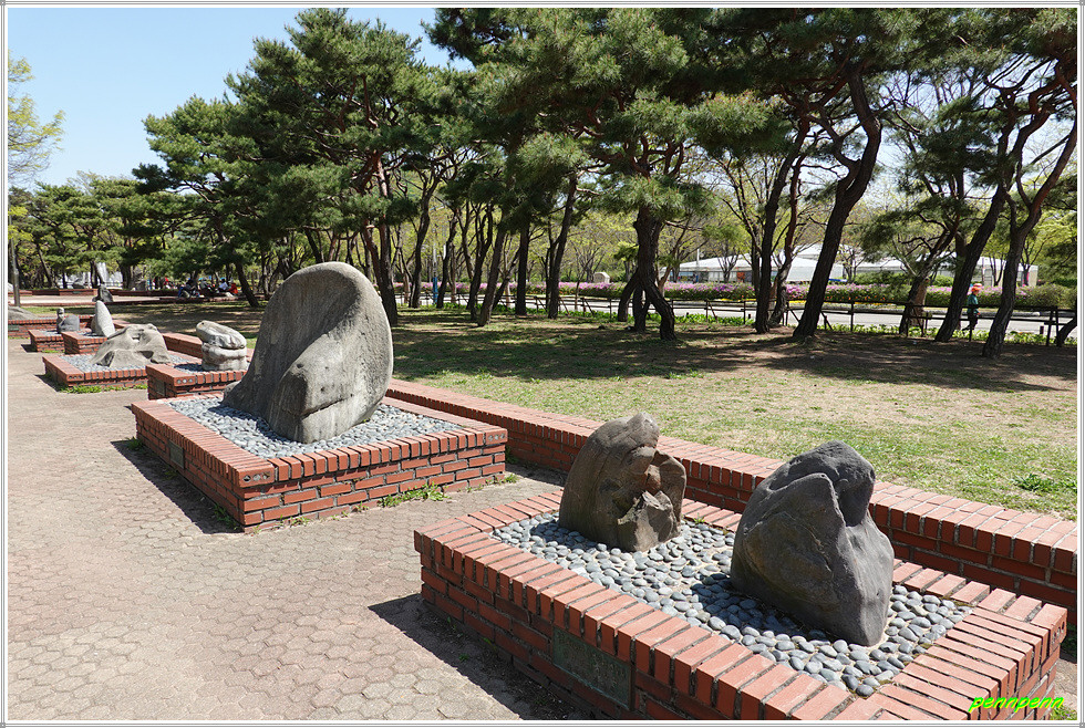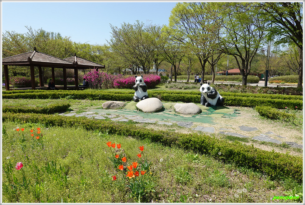 꽃 전시관 다음에는 중국 판다곰 두 마리가 놀고 있는 조형물, 부엉이(?) 모양 조형물도 보입니다. 공원안내소 앞에는 공원 정문인데 출입문이 근사하군요. 대로 맞은편으로 가서 애인광장 쪽으로 걷습니다. 목재문화 체험장 입구를 지나면 수석원입니다.