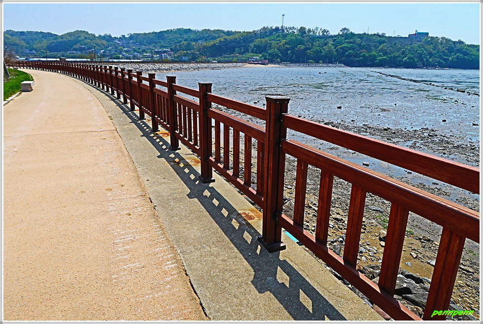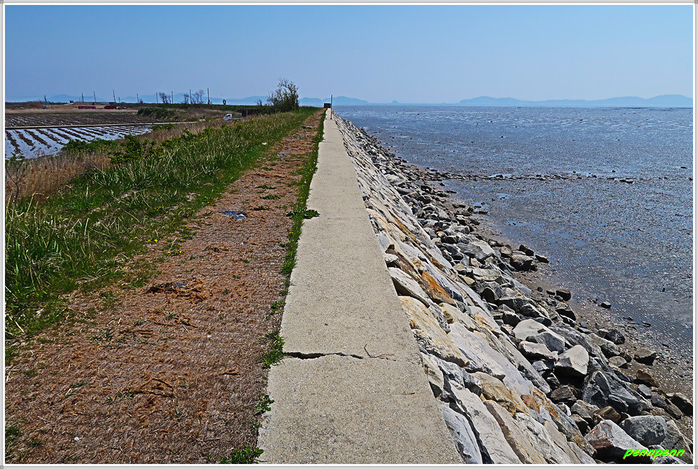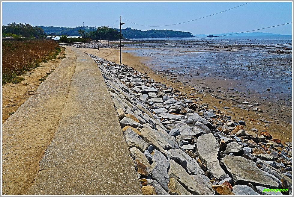 글램핑(다양한 편의시설과 서비스를 갖춘 고급스러운 캠핑장)을 뒤로하고 낮은 나무계단을 올라 내려서면 다시 매우 긴 규모의 방조제인데 강화나들길 그림안내문에는 7코스를 “갯벌보러 가는 길”로 표기해 두고 있습니다. 강화나들길 홈페이지에는 마지막인 20코스가 “갯벌보러 가는 길”로 적혀 있는데 이곳이 20코스와 중복되는 지역이라서 그림안내문을 제작한 이도 이를 혼동한 모양입니다.