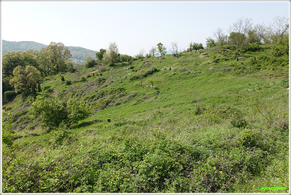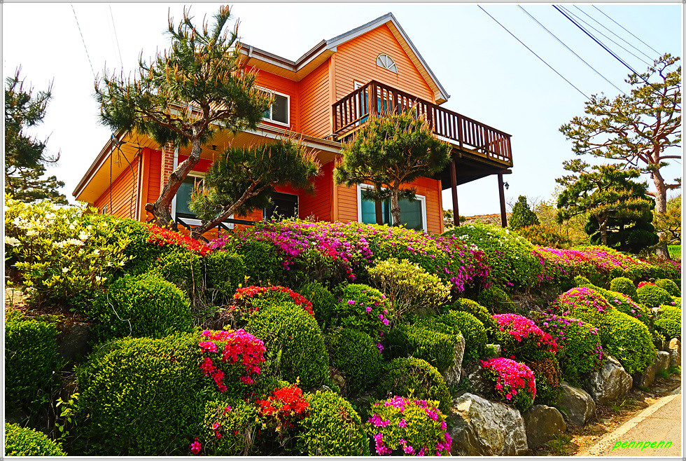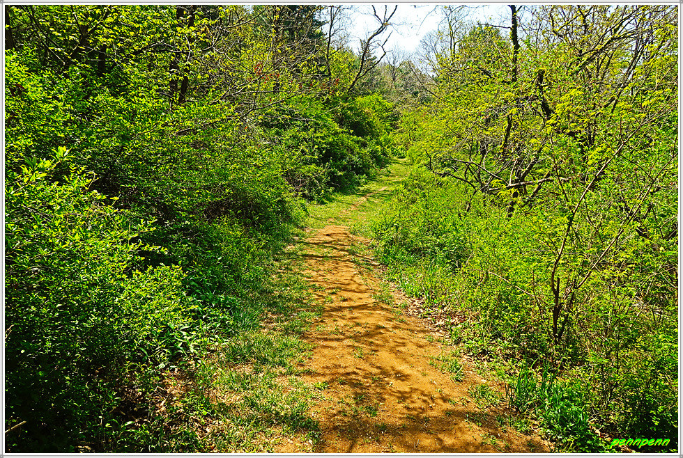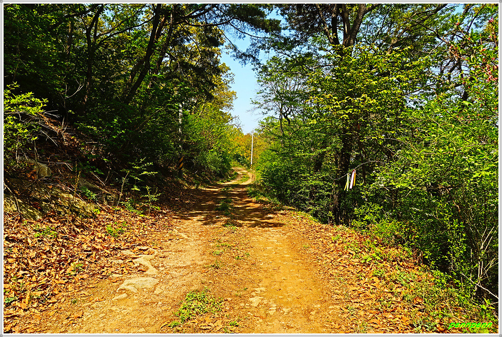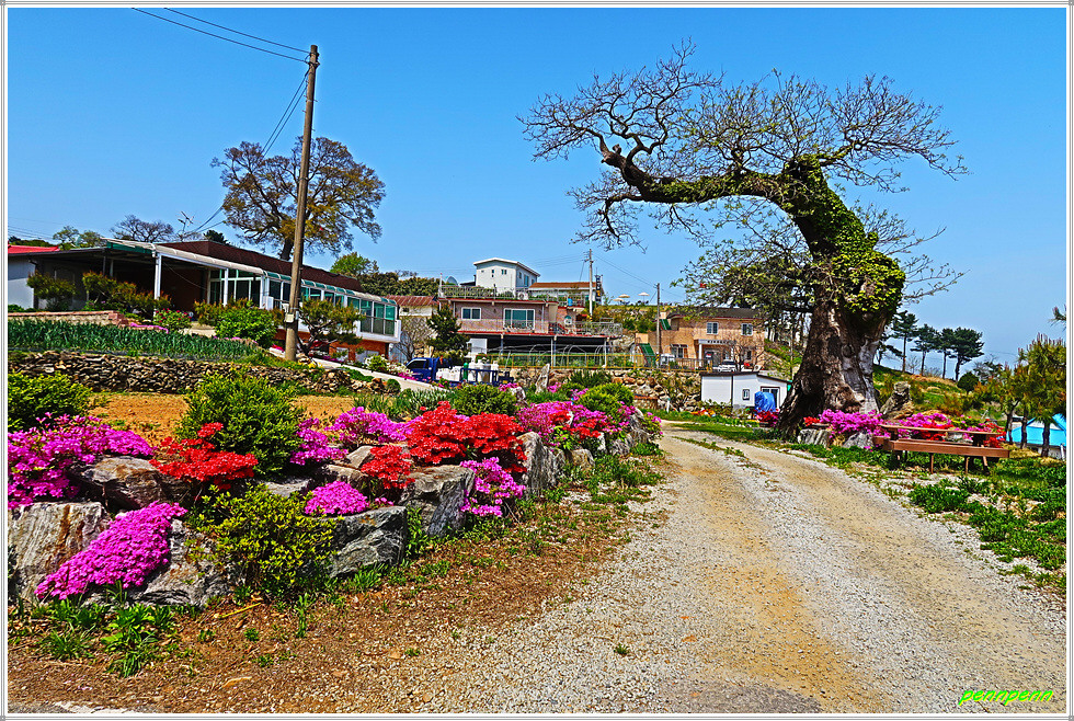 도로변에는 갖가지 색상의 영산홍이 피어 있어 나홀로 걷는 길손의 피로를 풀어줍니다. 언덕에는 매우 오래되어 보이는 노거수(老巨樹) 한그루가 있는데 가까이 가 보아도 보호수로 지정되었다는 안내문이 보이지 않습니다. 점점 고도를 높이니 북서쪽으로 석모도가 보이더군요. 상봉 북쪽의 산복도로(임도)를 가노라니 길섶에 “성공회 아이오나 순례길”이라는 리본이 강화나들길 리본과 나란히 걸려 있습니다.