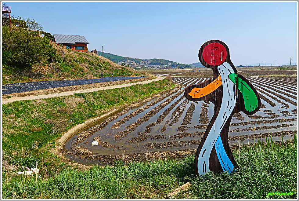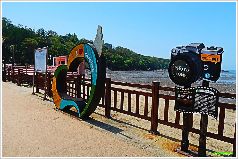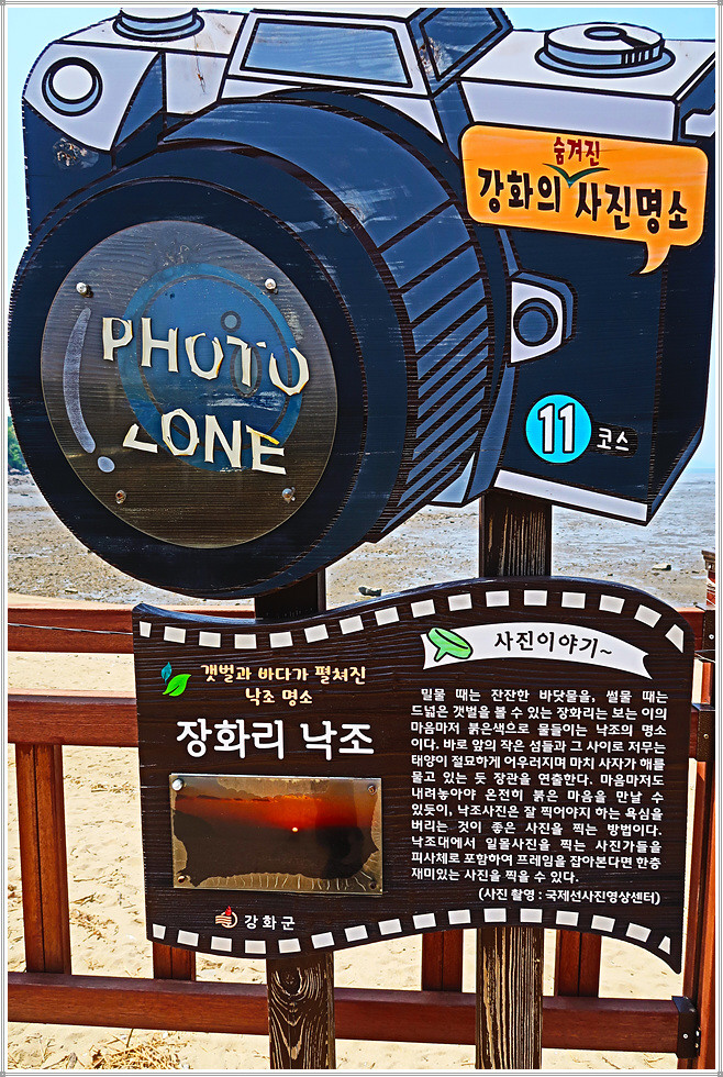 장화리 일몰조망지인 낙조대 인근에는 하트조형물과 포토존 안내문이 있습니다. 이곳의 일몰은 작은 섬들 사이로 저무는 태양이 절묘한 조화를 이룬다고 하는군요. 낙조대에는 강화나들길 공식 조형물과 저어새 보호 안내문이 있습니다. 저어새는 멸종위기종으로 몸 길이가 약 80cm 내외, 몸무게는 약 1.5kg내외입니다. 방조제 수문에는 이규보의 시를 서예가 목은 한성순이 적은 서예작품이 걸려 있어 매우 이색적입니다.