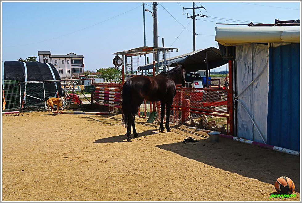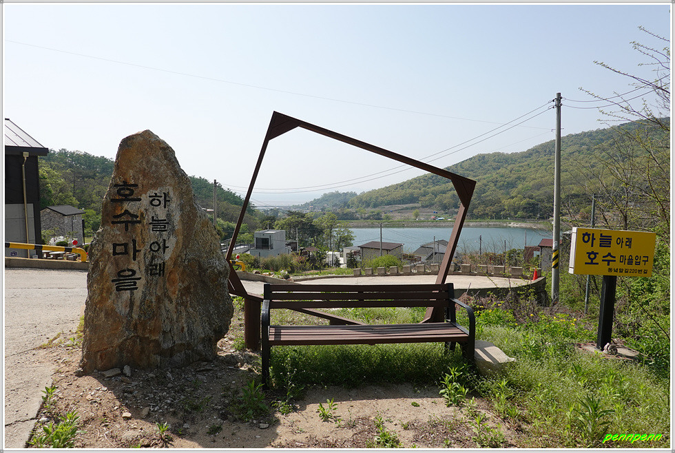 여기서 북쪽으로 가는 갈은 다소 까다롭지만 공식이정표와 리본을 잘 확인하면 따라갈 수 있습니다. 말 사육장을 지나 DC마트 직전 좌측으로 가는 게 올바른 방법입니다. 이쪽에도 반듯한 집이 더러 보이네요. 이제부터는 산의 능선을 남북으로 가로지르는 도로를 따라 갑니다. 김촌저수지가 보이는 곳에는 하늘아래 호수마을이라는 이정표가 세워져 있습니다. 도로변 울타리에 조성된 조형물이 눈길을 끄는군요.