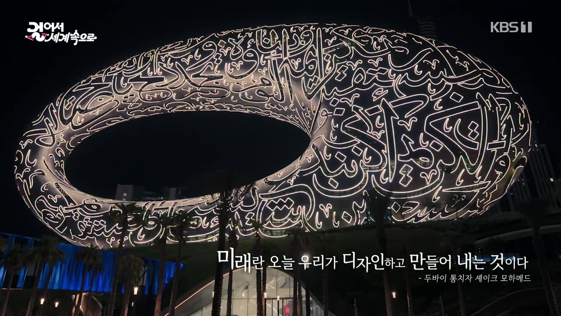 두바이 미래박물관은 지상 77m 높이에 1,024개의 스테인리스 스틸로 설계된 도너츠 형태의 건축물로 멋진 서체의 아랍 캘리그래피가 건물외관을 표현하고 있습니다. 두바이에 대한 미래 비전을 담아 이를 건축한 두바이 통치자(세이크 모하메드)는 “미래는 기다릴 대상이 아니라 오늘 우리가 디자인하고 만들어 내는 것”이라는 명언을 남겼다고 하네요.