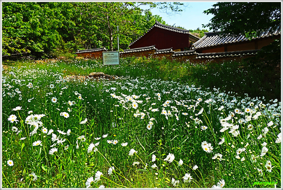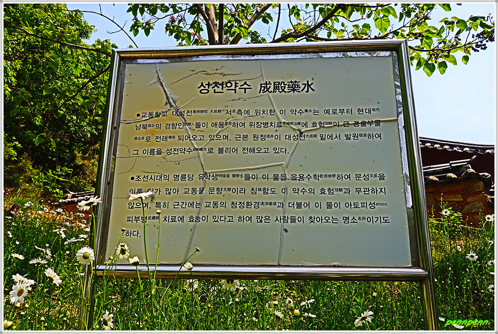 향교 정문인 외삼문에서 좌측으로 가면 성전약수가 있는데 예로부터 위장병 치료에 효험이 큰 것으로 알려져 있으며, 대성전 밑에서 발원해 성전(成殿)약수로 부르고 있습니다. 근래에는 아토피성 피부염 치료에 효능이 있다고 해 많은 사람들이 찾아온다는군요. 약수터 앞에는 샤스타데이지가 흐드러지게 피어 있어 길손의 발걸음을 멈추게 합니다.