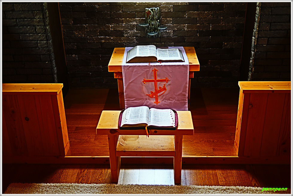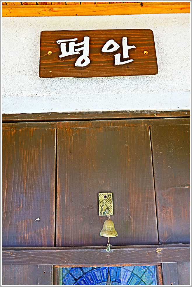 안으로 들어서면 먼저 평안이라는 글씨가 있는데 겨우 1-2명이 앉을 수 있는 성전에는 성경과 십자가가 놓여 있고 창문 밖에는 십자가가 세워져 있습니다. 또한 교회답게 유리창문은 스테인드글라스로 채색되어 있네요. “나와 하나님만을 위한 예배당”개념으로 세상에서 제일 작은 교회로 만들었답니다.