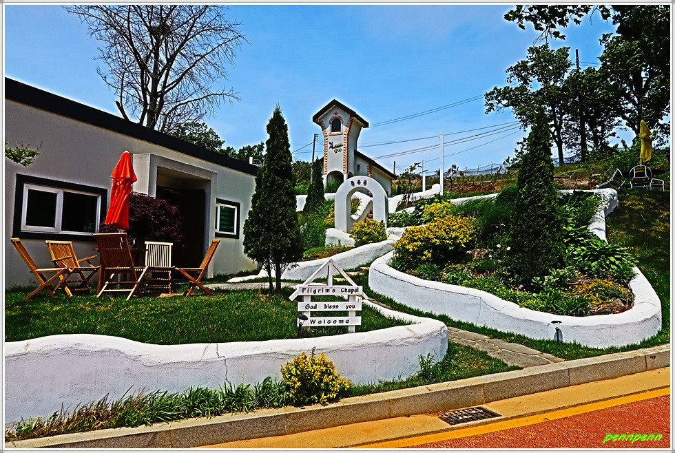 먼저 담장을 보면 곡선형태인데 이는 천국의 정원을 컨셉트로 하여 춤추는 정원으로 꾸몄다는군요. 정문에는 영어로 Pilgrim's Chapel(순례자의 교회)이라고 쓴 현판이 세워져 있고 좁은 문을 지나면 바로 예배당입니다. 그야말로 소인국에 온 것처럼 작지만 아름다운 교회가 여행자를 맞이합니다.