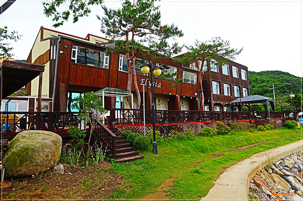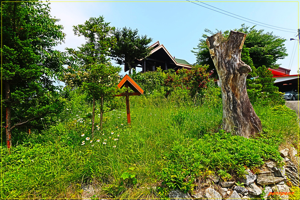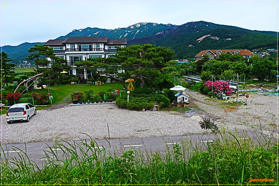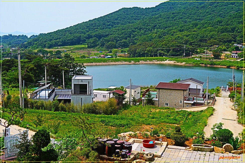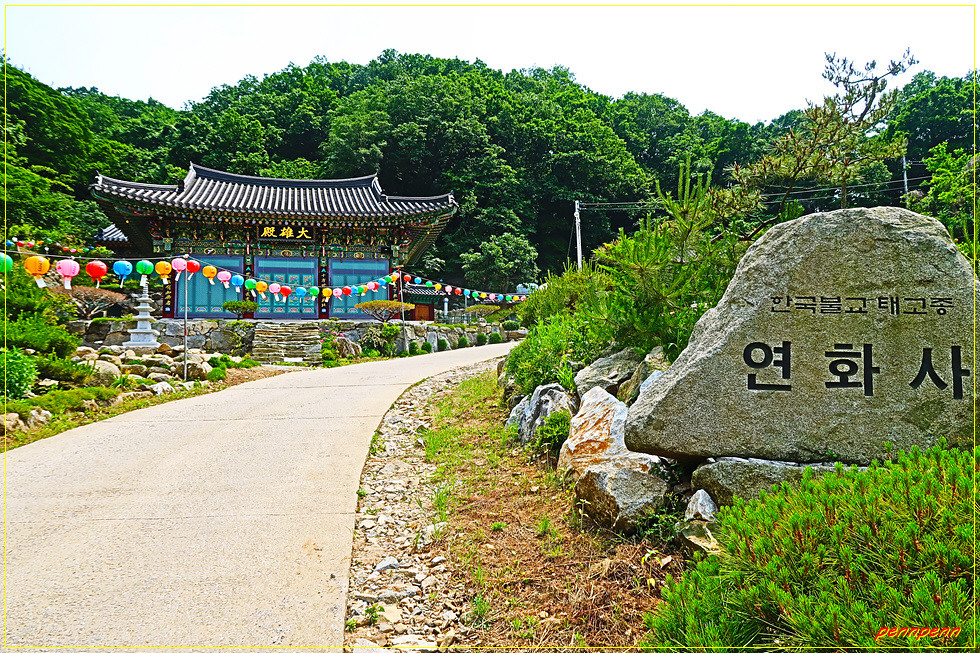 여기서 우측인 북동쪽으로 가면 차로인 여차리 해안남로를 만나게 되는데 다시 우측으로 조금 가다가 DC마트가 보이면 좌측으로 진입하는게 올바른 길찾기입니다. 좌측에 보이는 화남교회를 뒤로하고 차량통행이 가능한 도로를 걸으면 한참 후 장화리저수지변에 옹기종기 자리 잡은 하늘아래 호수마을 입구를 지나갑니다. 반듯한 저택 같은 건축물을 보면서 이런 곳에서 사는 분들은 참 해복할 것 같다는 생각을 해보네요. 강화청소년수련원 입구와 솔입향펜션을 지나 고갯마루를 넘으면 대한북교태고종 계열의 연화사입니다.