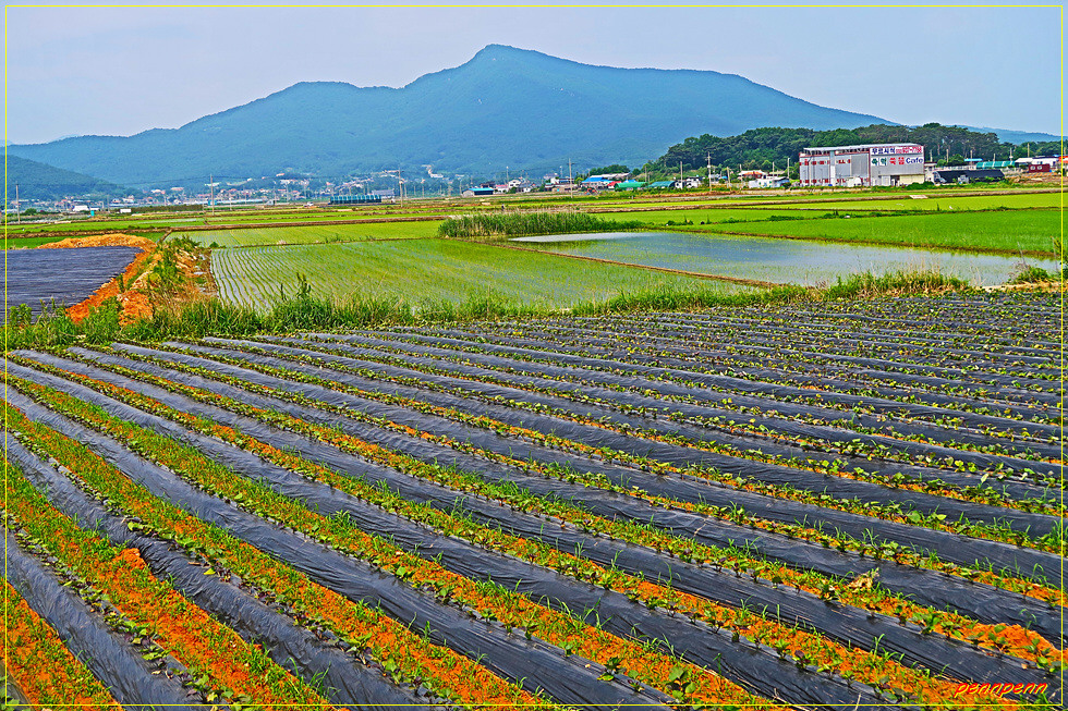 잠시 후 직사각형 모습의 흥왕저수지가 나타났는데 이곳은 강화도남부의 이름난 낚시터라고 합니다. 흥왕저수지 뒤로 산림청 선정 100대 명산에 당당히 이름을 올린 마니산(472m)의 능선이 허연 바위를 드러내고 있습니다. 낚시터가 보이는 곳에 나들길 공식 4각액자틀이 있는데 이곳에는 중앙에 탁자를 배치해 놓아 여행자들이 쉬어가기에 안성맞춤입니다. 이곳에있는 20코스 정보에 의하면 거리는 23km가 아니라 11.4km로 표기되어 있군요.