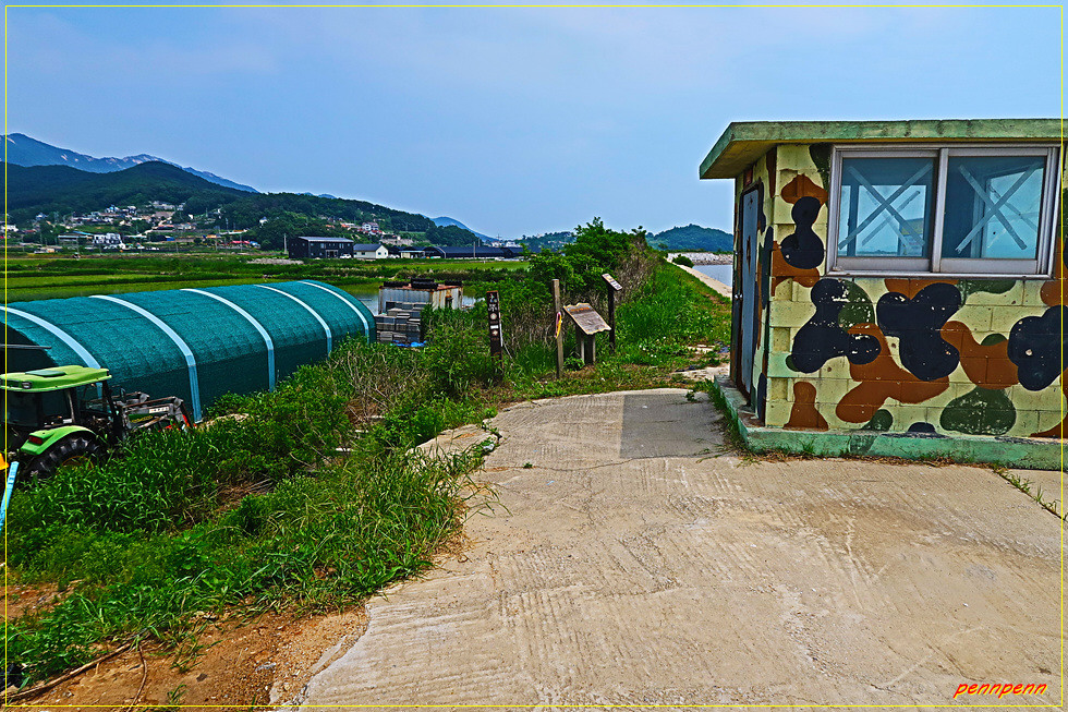 경계초소가 있는 곳의 20코스 이정목에는 지나온 거리가 7.7km, 남은 거리가 1.7km로 전체 거리가 9.4km로 표기되어 있어 조금 전 11.4km라고 씌어져 있던 것과는 또 2km 차이가 나는군요. 아무튼 군데군데 보이는 다른 표기는 여행자들을 헷갈리게 만드는 요인입니다. 필자도 여기서 고민에 빠집니다. 겨우 1.7km만 가면 목적지인 갯벌센터이지만 이곳에서 는 버스의 운행회수가 적어 오래 기다려야하는 불편이 있습니다. 따라서 필자는 여기서 지난번 7코스를 걸으며 이미 답사했던 갯벌센터대신 화도터미널로 가기로 결심합니다. 이 길은 7코스를 답사하며 지나갔던 길이어서 눈을 감고도 갈 수 있습니다.
