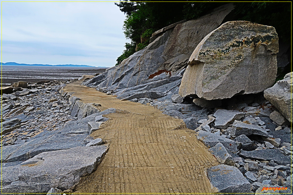 도로가 끝나는 지점에서 나들길은 해변으로 이어지는데 해변가 바위지대에도 산책로를 조성해 놓은 게 돋보입니다. 20코스의 이름이 “갯벌 보러 가는 길”임을 알려주듯 바다로 눈을 돌리면 온통 갯벌뿐입니다. 잠시 후 인공적으로 조성한 산책로는 끝났지만 해변가 암석지대로 나들길은 계속 됩니다.