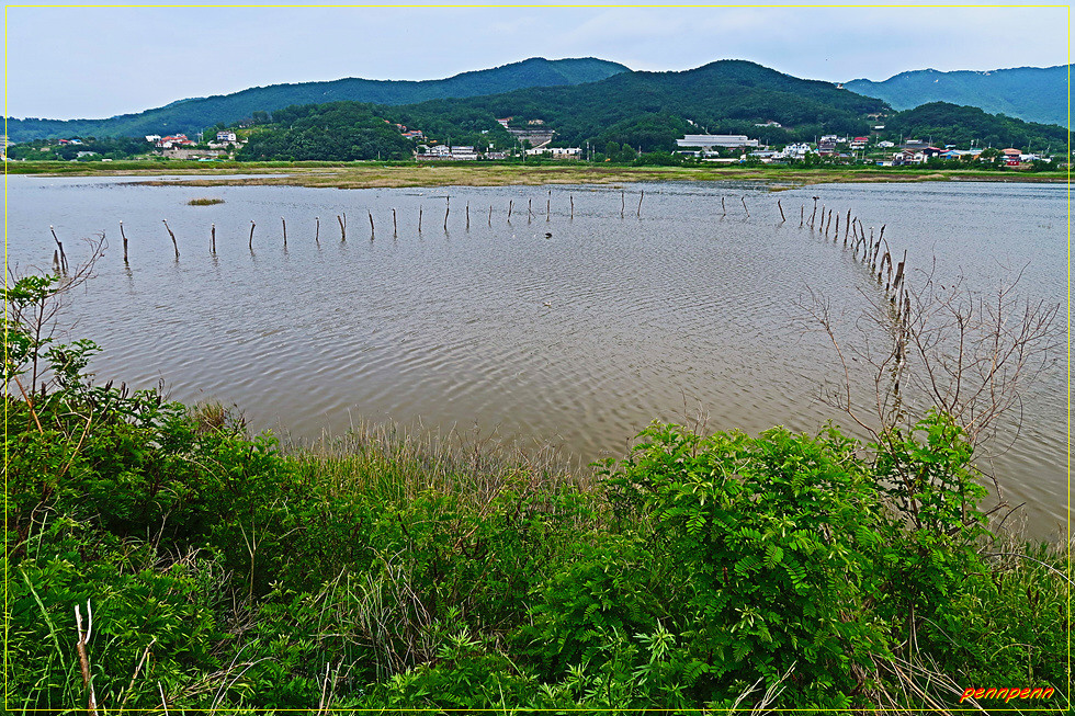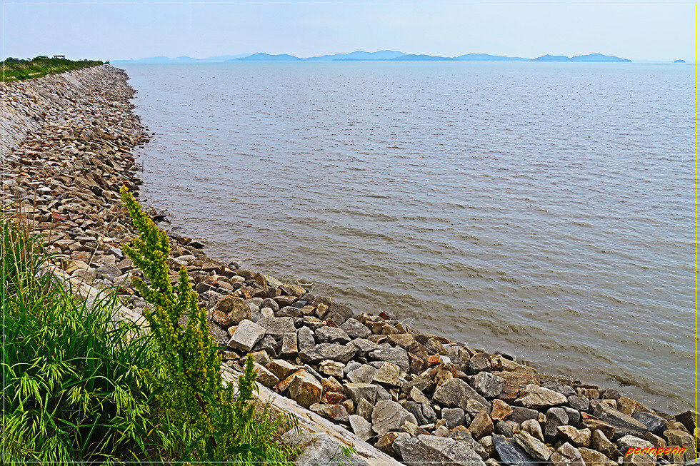 바위지대를 지나 다시 제방으로 오릅니다. 그런데 해안가로 오다보니 내륙 쪽의 미루지돈대는 만나지 못하게 되었군요. 이름이 없는 큰 저수지 곁을 지나갑니다. 저수지에는 장대 같은 게 듬성듬성 박혀 있고 꼭대기마다 물새가 한 마리씩 앉아 있는 모습이 마치 새의 조형물을 올려놓은 것 같습니다. 이제 해안의 갯벌은 밀물로 완전히 물에 잠긴 모습입니다.