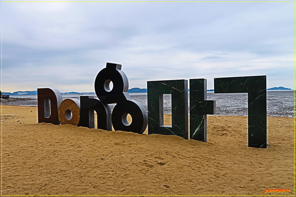 동막해변은 이름난 유원지여서 그런지 각종 카페와 음식점 및 펜션 등 편의시설이 엄청 많습니다. 그런데 백사장에 세워둔 동막(Dong막)이라는 영문과 한글 혼합글씨가 영 마음에 들지 않습니다. 한글이면 한글, 영문이면 영문, 아니면 영문과 한글을 동시에 표기할 수도 있겠지만 같은 단어 속에 영어와 한글을 하나씩 표기한 것은 정말 엉뚱합니다. 다만 이런 표현방식이 요즘의 트렌드라면 할 말은 없네요. 해변을 지나가는 데 때마침 갈매기 떼가 가까이에서 날고 있군요.