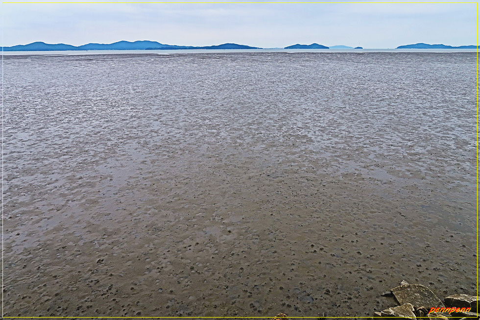 바윗길을 뒤로하고 제방길로 올라가 엘리시아 펜션을 지나갑니다. 이곳의 갯벌은 거의 검은 색을 띠고 있군요. 대하(큰새우)양식장을 지나 U자형으로 조성된 제방길을 걷습니다. 나들길 공식 이정목에는 목적지까지의 거리가 불과 7.2km 남았다고 표기되어 있는데 이는 위에서도 살펴보았듯이 목적지가 강화나들길 홈페이지에 기재된 화도터미널이 아니라 남쪽의 갯벌센터이기 때문입니다.