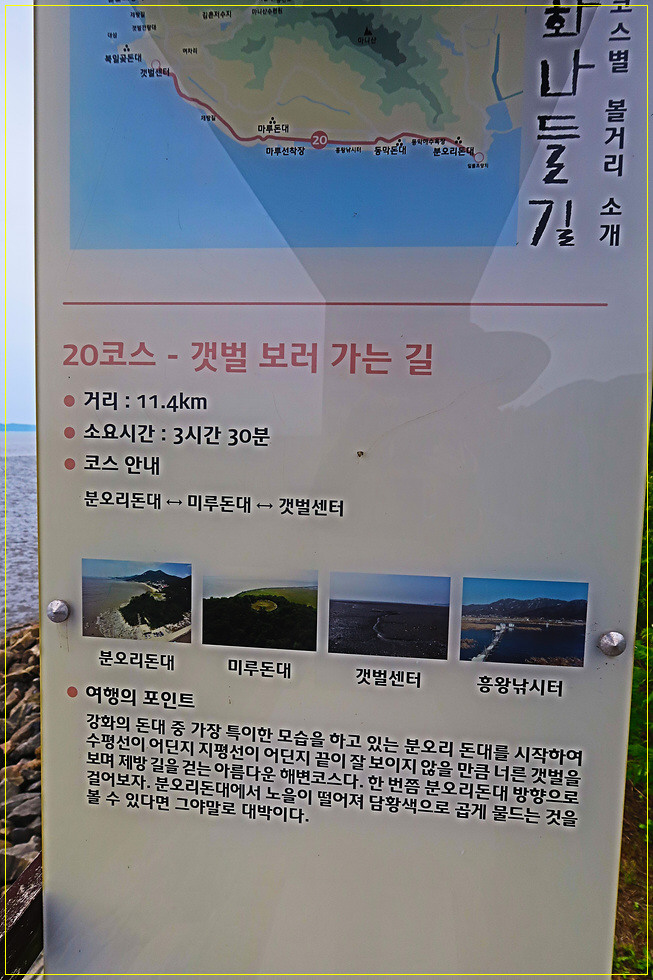 아무리 코스가 좋아도 하루에 23km를 걷는다는 것은 보통사람으로서는 사실 쉬운 일이 아니어서 필자도 걱정이 태산이었습니다. 그런데 실제로 현장에 가보니 거리표기가 짧게 되어 있어 의아했는데 중간에 만난 20코스 지도에는 이 구간을 분오리돈대에서 갯벌센터까지로 표기되어 있음을 발견했습니다. 실제로 갯벌센터에서 화도공영터미널까지는 이미 7코스(낙조 보러 가는 길)에서 걸은 길입니다. 따라서 실제로 20코스의 거리는 약 반으로 줄어들게 되는 것이지요. 그러므로 마지막 코스인 20코스는 가벼운 마음으로 답사해도 될 것입니다. 왜 강화나들길 홈페이지에는 7코스 일부와 20코스 구간표기를 중복되게 해 보통사람들을 주눅 들게 하는지 모르겠습니다.