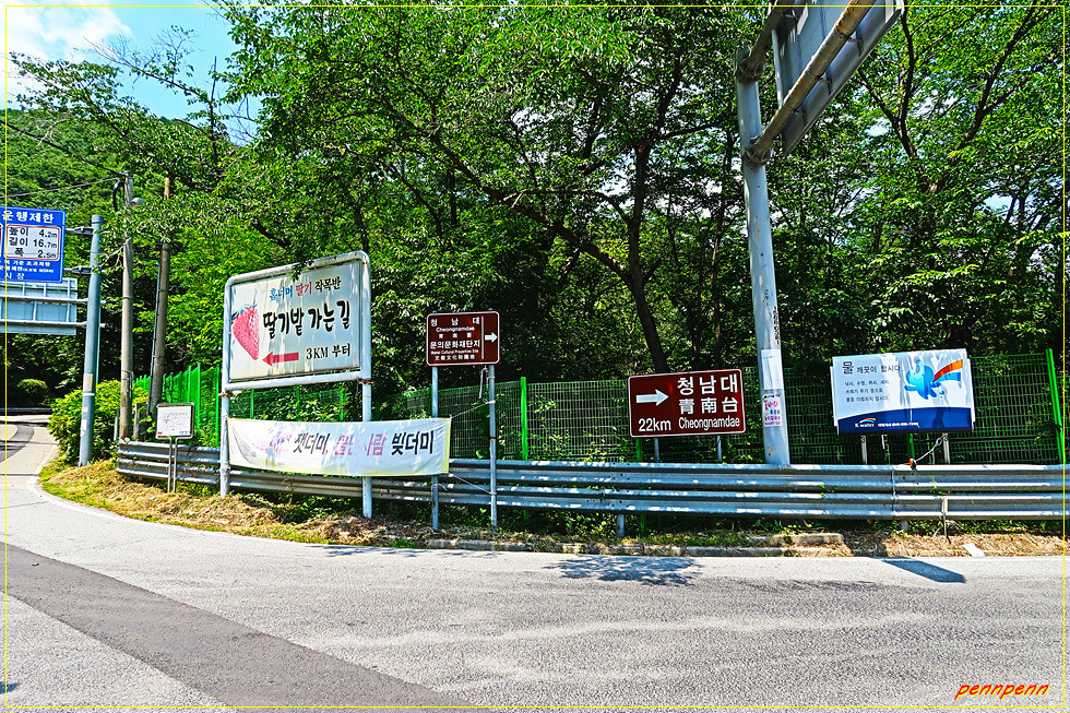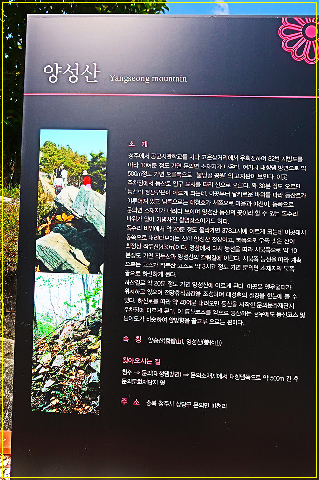 문의사거리로 가는 길목의 우측에는 코카콜라라는 글씨가 벽면 가득 칠해진 건축물이 있는데 그 용도를 잘 모르겠습니다. 문의사거리 화단에는 청남대 이정표와 “문의 열리네요. 그대가 들어오죠”라는 입체글씨가 조형물과 함께 조성되어 있습니다. 문의사거리에서 서쪽으로 “문의시내로”를 따라 갑니다. 미천1리 버스정류장 및 미천6리 마을표석과 문의초등학교 입구를 지나면 문의면사무소인데 사무소 앞에 가야할 양성산(301m) 안내문이 있습니다.