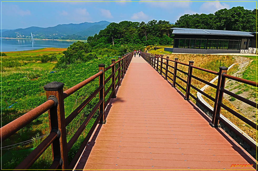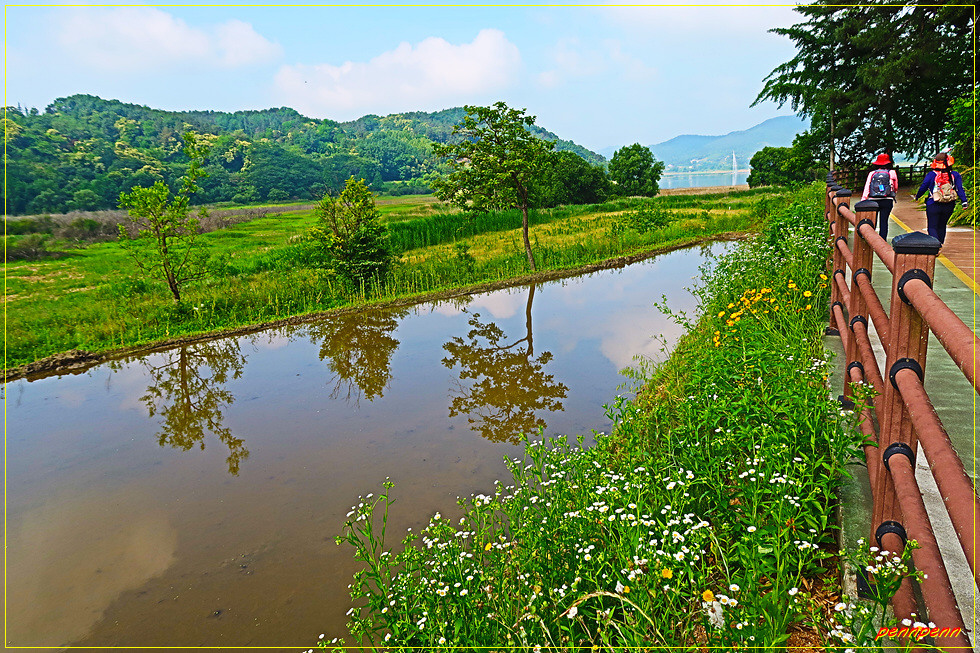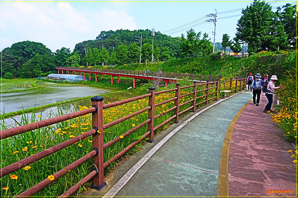 20구간의 들머리는 청주시 문의면 노현리습지공원입니다. 습지공원 옆 노현교 소나무 숲에서 품곡천을 따라 공사중인 습지공원 가림막 옆길로 진입합니다. 가림막을 벗어나니 무논이 나오는데 안전목책 길에는 금계국이 화려하게 피어 길손을 환영합니다. 이 길은 보행로와 자전거길이 동시에 조성되어 있군요. 나무데크길을 지나며 대청호로 눈을 돌리면 분수가 시원한 물줄기를 하늘을 향해 내뿜고 있습니다.