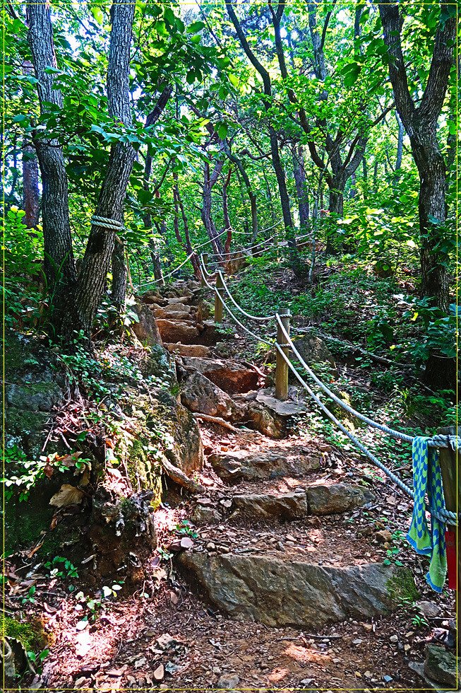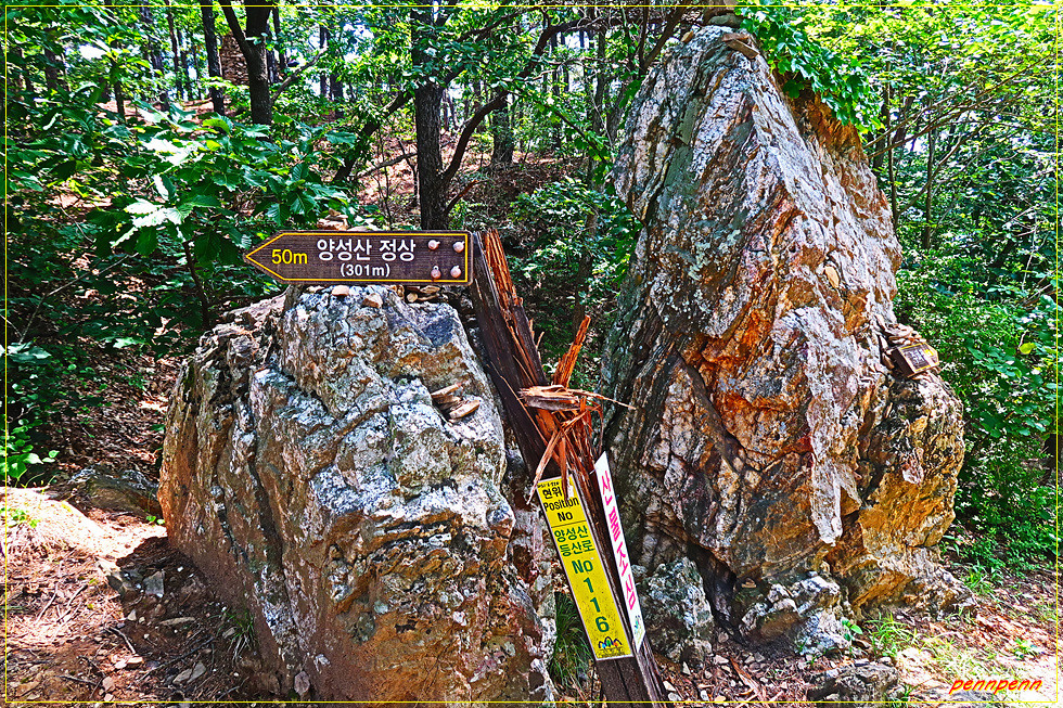 여기서 정상까지의 거리는 200m에 불과하지만 오름길이 상당히 가팔라 만만치 않습니다. 정상 직전에는 정상까지 50m 남았다는 이정표가 땅에 떨어져 있어 일행 중 하나가 이를 암석에 올려놓아 사진을 찍었습니다. 막상 양성산(301m) 정상에는 돌탑만 쌓여 있을 뿐 정상을 알리는 아무런 안내문이 없어 등산객들을 실망시킵니다. 정상에서는 숲으로 인해 조망도 전혀 할 수 없더군요.