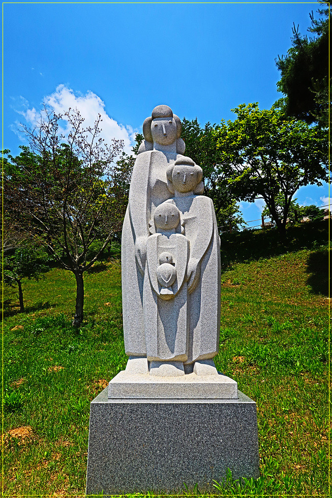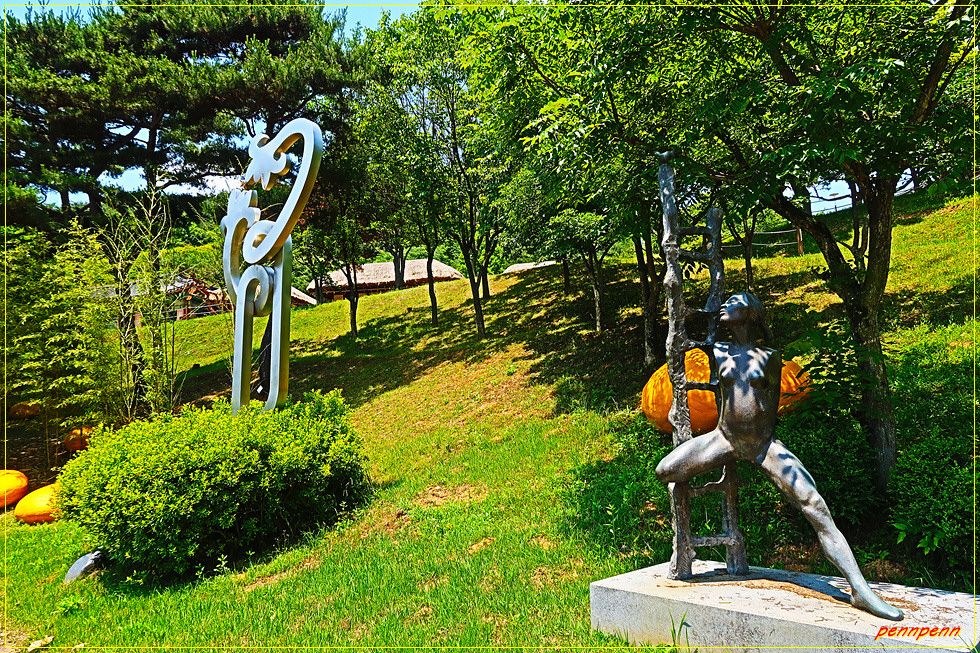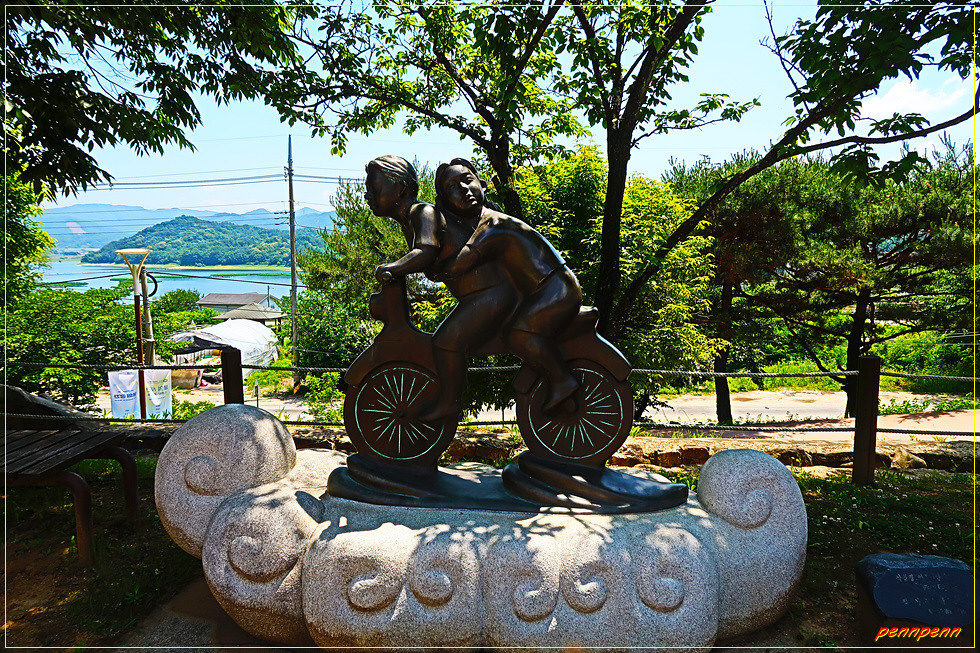 대형 주차장으로 들어서면 문화재단지 안내문과 배치도가 있고 하트조형물 뒤에 있는 매표소인 양성문 통과하면 조각공원은 단지 내 남서쪽에 위치하고 있습니다. 대청호조각공원은 청원군의 조각현상공모에서 입상한 작품과 초대작가 작품을 아름다운 대청호와 잘 어우러지도록 배치한 조각공원(2005년 개원)입니다. 이들 작품을 사진으로 소개합니다.