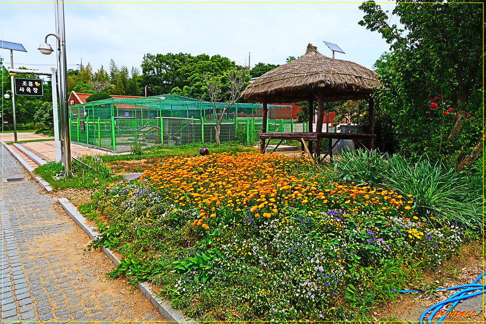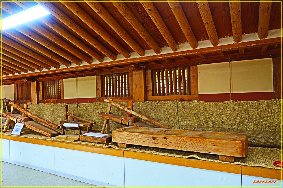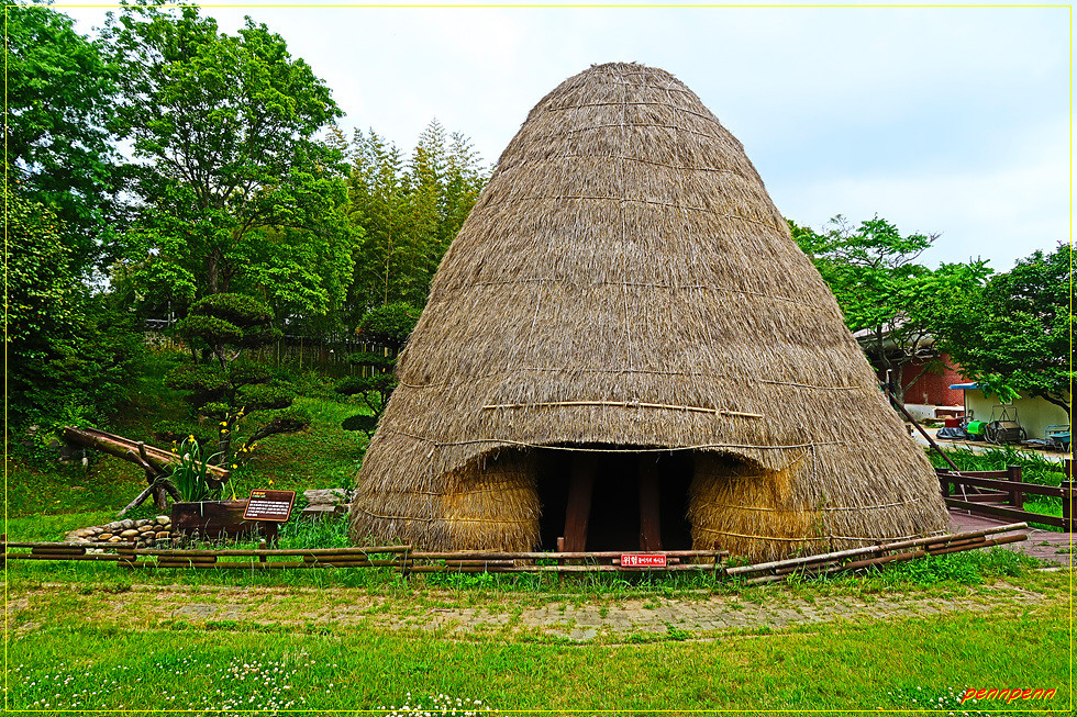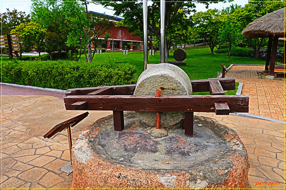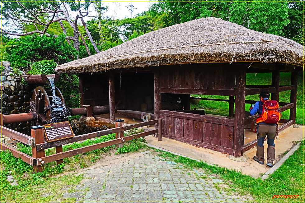 자연학습장과 원두막을 지나면 작은 동물원인데, 이곳에는 다양한 닭의 품종을 볼 수 있습니다. 인근에는 지붕이 매우 높은 특이한 형태의 움집 같은 옛집이 보이는데 그 옆에는 물통방아가 설치되어 있습니다. 물통방아는 물레방아보다 수량이 적은 곳에 설치한다는군요. 물통방아 옆에는 물레방아도 있어 둘의 모양을 비교할 수 있군요.