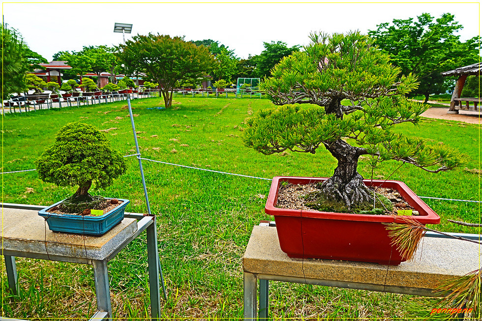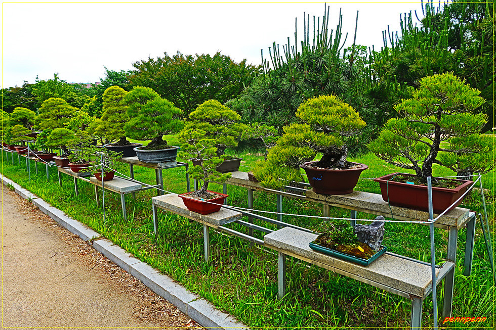 정원에는 분재도 있군요. “분재(盆栽)”란 한자만으로는 '그릇 안에 묘목을 담는 것' 또는 '화분에서 재배하는 것'을 뜻하지만, 관용적으로 '나무를 화분에 심어 난쟁이로 자라게 하는 것, 또는 그 결과물'을 가리킵니다. 분재는 식물이 환경에 맞춰 성장하는 성향을 극단적으로 이용해서 만드는데, 작고 얕은 화분을 척박한 흙으로 채우고, 바람과 햇빛이 잘 드는 곳에 두어 생장을 억제합니다.
