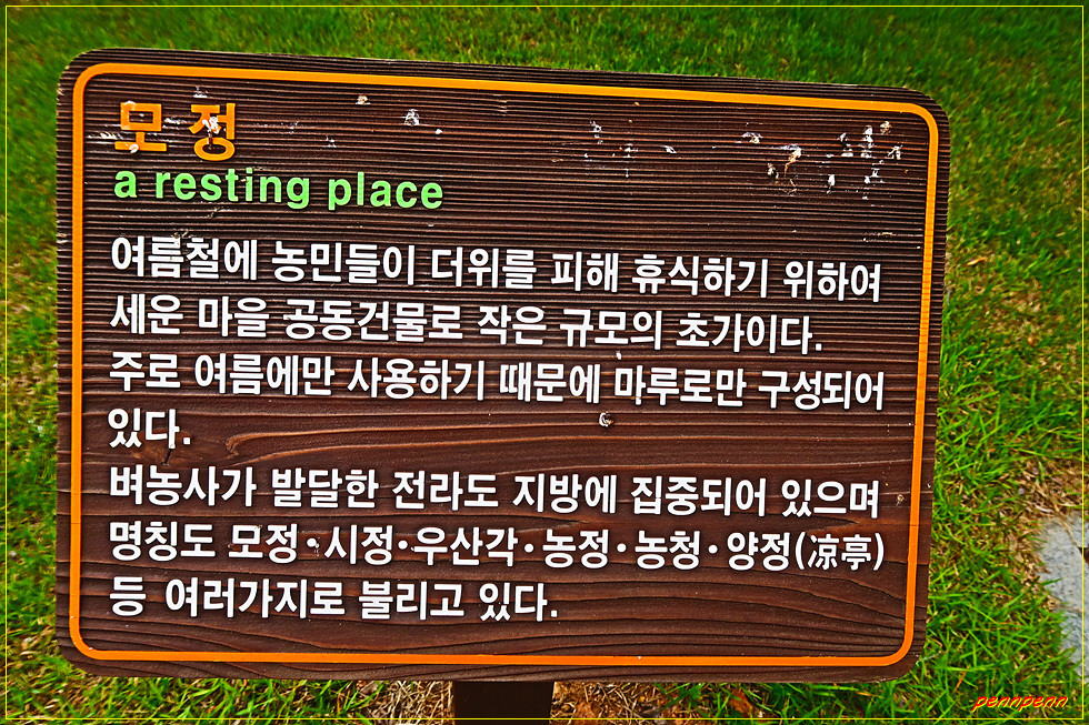 가을에 수확한 벼를 보관할 수 있는 나락뒤주를 보니 뒤주에 갇혀 죽임을 당한 사도세자가 생각납니다. 작은 연못에는 비단잉어가 무리지어 헤엄치며, 모정은 하절기에 농민들이 더위를 피하기 위해 지은 공동체건물로 마루만 있습니다.