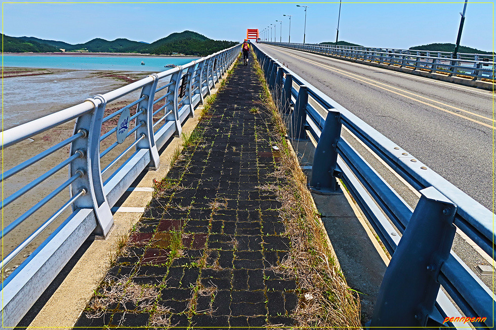 화사하게 피어 있는 낮달맞이꽃을 보며 탄동2리 하탑마을 버스정류장을 지나 사옥대교에 오르면 그 아래로 천착장이 있습니다. 솔섬(송도)과 사옥도를 이어주는 사옥대교는 교량은 길지만 교량 위 시설물이 없는 평범한 다리여서 밋밋해 보이는군요. 북서쪽으로는 목적지인 임자2대교가 아련하게 보입니다.