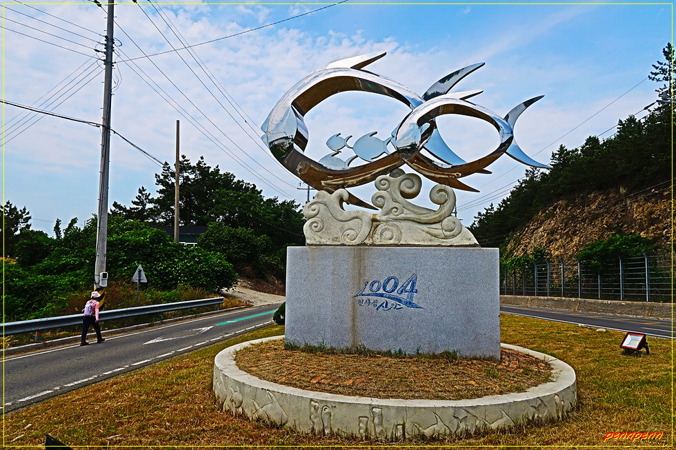 수산물유통센터 앞에는 많은 차량들이 주차를 하고 있어 이곳의 인기를 실감합니다. 805번 지방도로(지도중도로) 합류점에 있는 물고기 조형물을 뒤로하고 도로를 따라 가면서 송도교를 건넙니다. 길섶에는 수확한 양파가 그대로 밭에 있네요. 송도교에서 우측으로 보면 신안젓갈타운이 보입니다. 신안젓갈타운은 서해랑길 25코스와 26코스의 기종점이어서 낯이 익습니다.