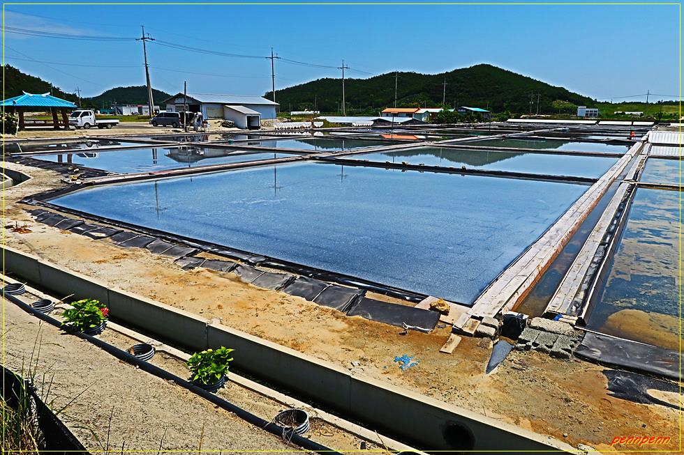 공사중인 도로를 통과해 동쪽으로 가다가 잠시 후 남하하는데 이곳에는 태양광발전 패널과 규모가 큰 염전이 보입니다. 서해랑길은 염전지대를 디귿자(ㄷ) 모양으로 돌아 다시 북상하는데 길섶에는 소금의 결정체도 보이고, 문이 열린 소금창고에는 소금밭에서 옮긴 소금도 있습니다. 소금창고 앞에는 일광염전에서 채취한 소금포대를 쌓아놓았군요. 이곳은 지도읍 탄동2리의 내도마을입니다.
