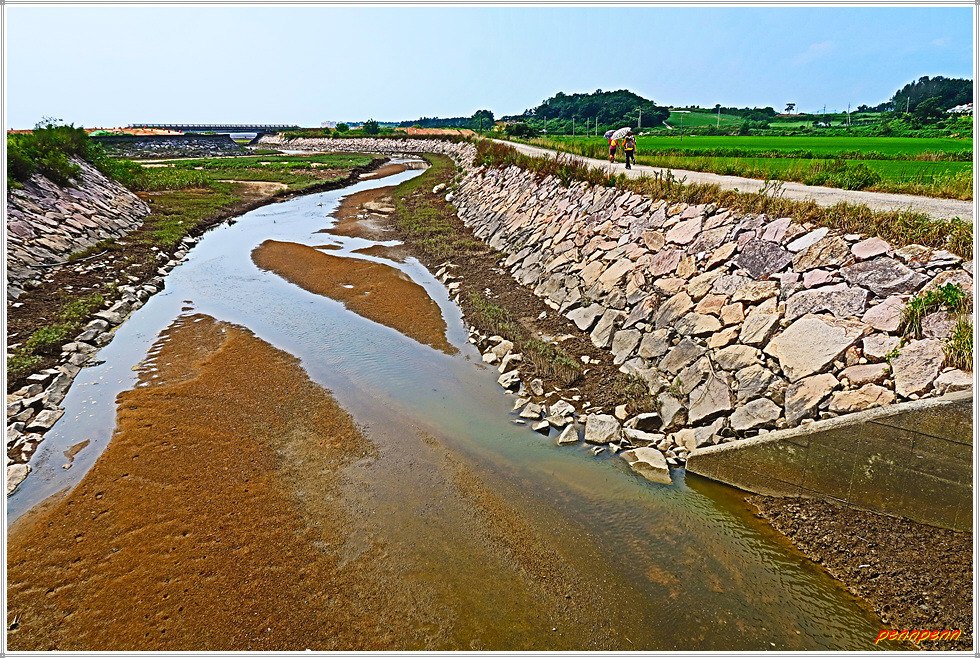 해운천에 걸린 해운1교를 건너 좌측으로 가면 자명천인데 이곳 자명천은 행정구역상으로 무안군 현경면 해운리와 함평군 함평읍 석성리의 경계입니다. 자명천의 다리를 건너 드디어 무안에서 함평으로 넘어왔습니다. 이제부터 목적지인 돌머리해변까지는 해안방조제길을 가야합니다. 공사 중인 다리를 뒤로하고 넓은 황토갯벌을 보며 걷는데 방조제 안쪽의 저수지는 민물이라 생명수이겠지요.