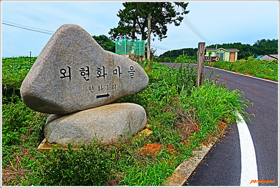 이곳은 갯벌도 농경지도 모두 황토빛입니다. 쪽파와 옥수수 군락지 및 녹색한우농장을 지나갑니다. 그러고 보면 오늘 길을 걸으며 여러 차례 가축의 분뇨냄새가 진동하는 축사를 만났습니다. 태양광발전패널을 지나면 외현화마을인데, 마을회관 앞에 쉼터인 평상이 있어 잠시 숨을 돌립니다. 마을에는 소박한 벽화가 그려져 있어 눈이 즐겁더군요.