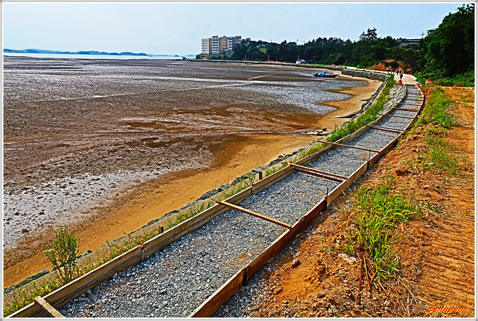 방조제보강공사구역을 지나면 드넓은 갯벌이 펼쳐지는데 맞은편 육지 어딘가에 우리가 출발한 곳이 있을 것입니다. 이제 돌머리해변의 스톤델리아 호텔&리조트 건축물이 랜드마크처럼 잘 보입니다. 방조제 보강공사용 석재가 많이 쌓여 있군요.