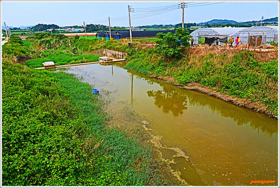 현지 이정표를 보니 아직도 목적지인 함평 돌머리해변까지는 8km 이상 남았군요. 한화3리 생록동마을로 가는데, 길섶에는 설악초와 낮달맞이꽃이 화사하게 피어 있습니다. 수로에 걸린 광각1교를 건너 좌측 후동마을 이정표를 따라 갑니다. 바닷가 방조제를 터벅터벅 걷는 발걸음이 무척 무겁습니다. 파도낙농체험목장에는 검은색 염소가 있네요. 내리쬐는 햇볕을 피하기 위해 사람들은 양산을 든 채 걸어갑니다.