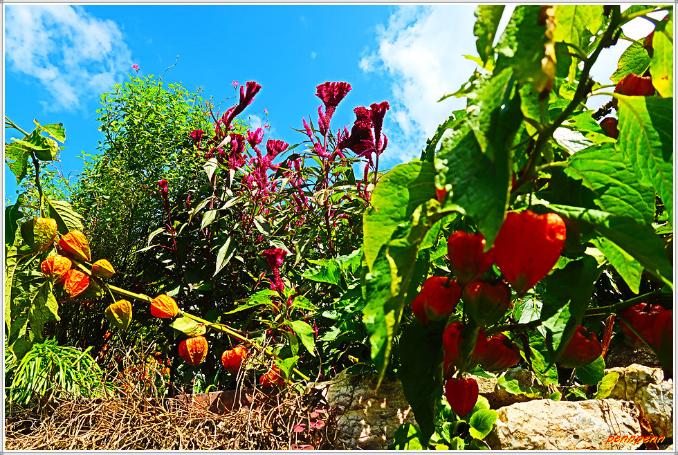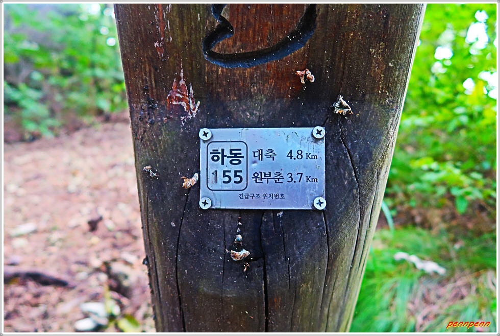 조릿대 군락지를 지나자 이제부터는 내리막 일변도의 길이어서 고생이 끝났다는 생각이 듭니다. 드디어 민가가 보이고 부춘 계곡 맞은 편 산세가 길손을 환영합니다. 마을 골목길을 돌아가면 목적지인 원부춘 마을회관입니다. 토착주민들은 부춘을 “부치동” 또는 “불출동”으로 부르고 있는데, 다음과 같은 지명유래가 있습니다. 하나는 마을이 형제봉 아래 산허리에 매달리듯 붙어 있다하여 부치동이라 했다는 설, 둘째는 고려시대때 원강사라는 큰절이 있어 부처골이라 하다가 이게 변하여 부춘이 되었다는 설, 그리고 마지막으로 고려 때 한유한 선생이 이 마을에 숨어 살아 생긴 지명이라 는 설이 있습니다.