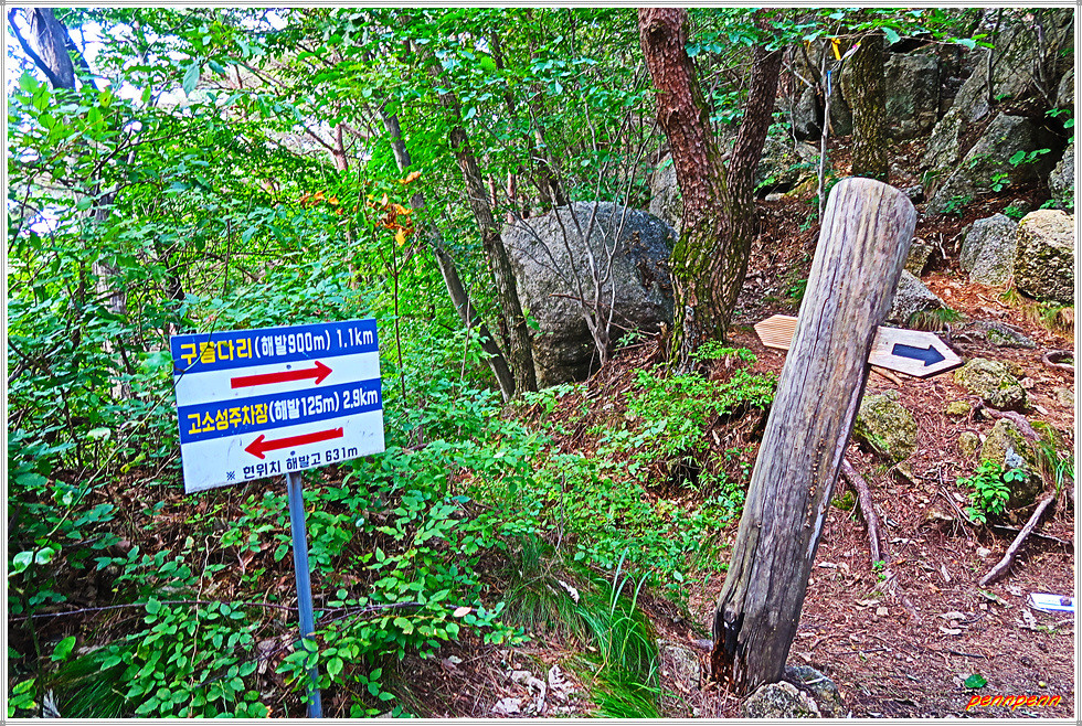 울창한 대나무 숲을 지나면 큰 나무 두 그루 옆에 지리산 둘레길 인증 스탬프 함이 있으니 놓치지 말아야합니다. 드디어 도로가 끝나고 숲길로 진입합니다. 길은 흙길이어서 위험하지는 않지만 경사도가 매우 급한 깔딱고개길입니다. 대축마을에서 4.8km 지점인 윗재에 도착합니다. 오늘 코스 중 가장 힘든 고개까지 오른 것입니다. 여기서 오른쪽으로 가면 해발고도 900m의 신선대 구름다리가 나오고, 좌측으로 가면 신선봉(586m)을 거쳐 고소성으로 이어집니다.