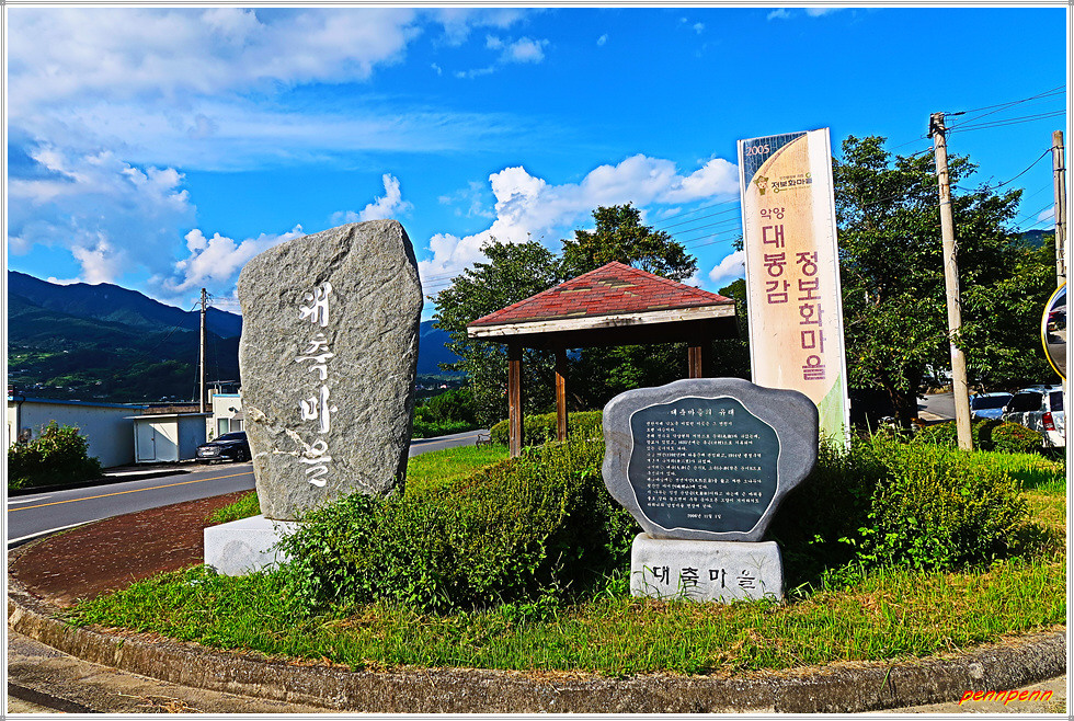 14코스의 들머리는 악양면 축지리 대축마을입니다. 대축마을은 변한시대 낙노국이었던 곳으로 마을의 역사가 매우 깊습니다. 마을 이름에 소축(丑)자가 들어간 것을 감안하면 소를 닮은 둔덕에 있는 마을을 뜻할 것입니다. 이곳은 악양 대봉감의 시배지이며, 천연기념물인 수령 600여년의 문암송이 있어 예로부터 사람들은 전쟁이나 위기에 처했을 때 문암송의 바위가 열려 피난처가 되어줄 거라 믿어왔다는데, 지금도 백중날에 문암대제를 올리며 마을의 안녕과 번영을 기원합니다.