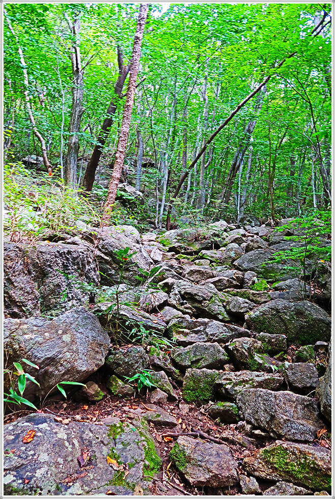 우리는 고개를 넘어갑니다. 이제부터는 깔딱 오르막이 끝나고 산허리를 돌아가는 길이 한참동안 이어집니다. 좌측으로 터진 공간에 서서 섬진강 너머 이름 모를 산의 능선을 바라봅니다. 능선 우회로이지만 간간이 나타나는 오름길은 숨을 헐떡이게 만들지요. 송림지역을 지나 바위를 넘으니 목적지인 원부춘까지 2.4km가 남았다는 이정표룰 보고는 생기를 되찾습니다.