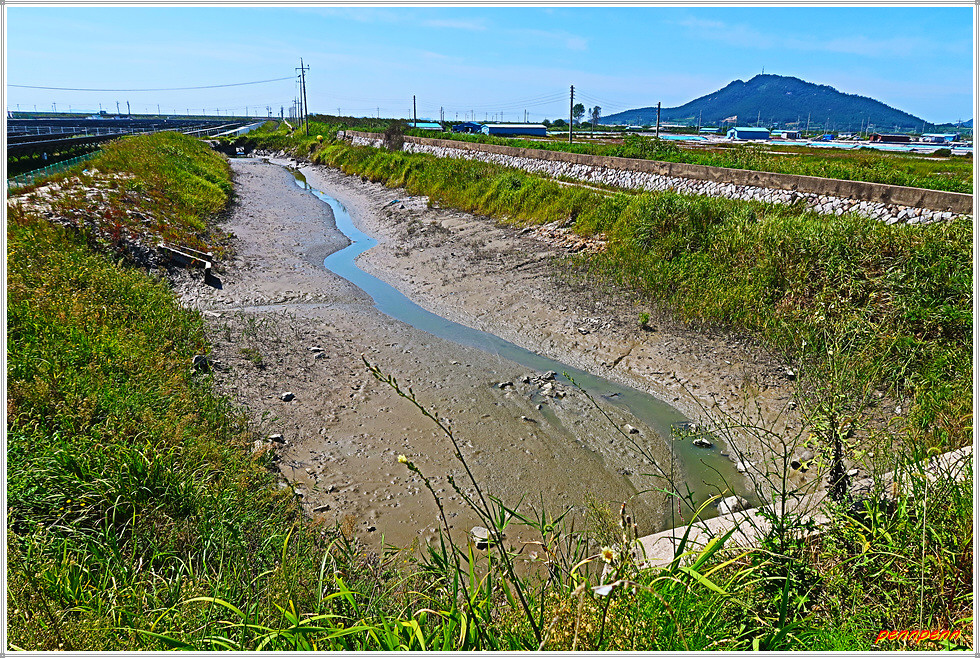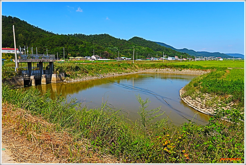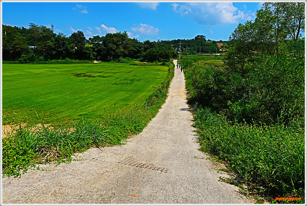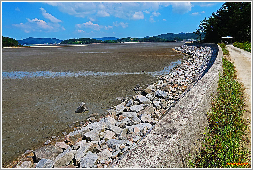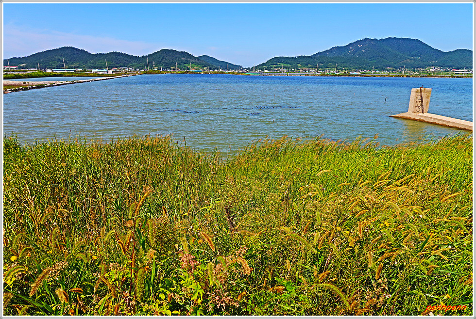 방조제 안쪽에는 새우 양식장과 염전이 있어 이 길이 천일염길인가 봅니다. 이곳 해안은 수산자원보호구역이기도 하지요. 이웃한 저수지는 아마도 염수를 보관하는 곳일 것입니다. 저주지변에는 강아지풀이 누렇게 변하고 있습니다. 옥실4리 버스종점과 성율농장(녹색한우) 그리고 누렇게 익어가는 벼논을 지나갑니다. 다시 서해랑길은 긴 방조제로 이어지는군요. 사실 오늘 코스는 90%이상 방조제길이어서 그늘이 전혀 없는 게 문제입니다. 다만 초속 3-4m 정도로 불어오는 가을바람은 뜨거운 태양빛을 완화하는데 크게 도움이 됩니다.
