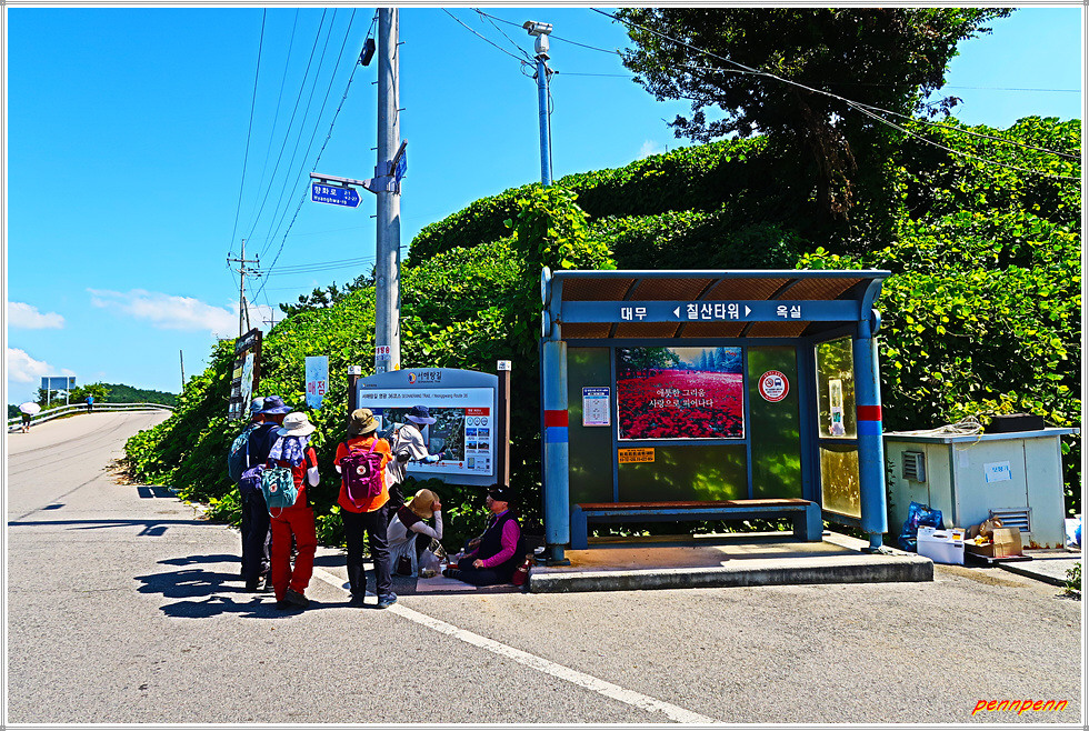 방조제 안쪽의 저수지를 보니 한결 시원해지는군요. 작은 고개를 넘어 가면서 통신철탑을 지나갑니다. 이제부터는 중간 기착지인 설도항을 보며 발걸음을 옮깁니다. 옥슬방조제 안쪽은 완전 초록의 세상이로군요. 다행히도 방조제 중간에 쉼터인 정자가 있어 잠시 쉬어갑니다. 낮 최고기온이 섭씨 27도라고 했지만 내리쬐는 뙤약볕아래 체감기온은 30도를 넘는 것 같은 환경에서 그늘이 있는 정자는 한마디로 오아시스이지요.