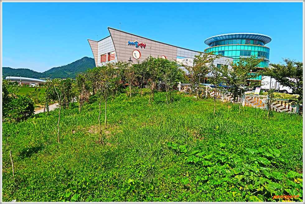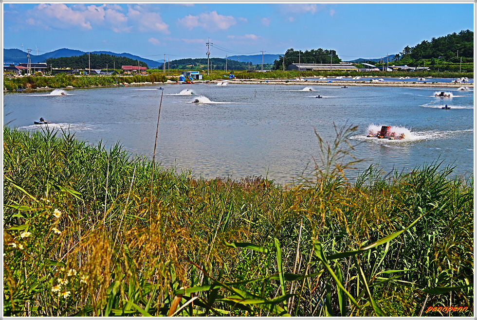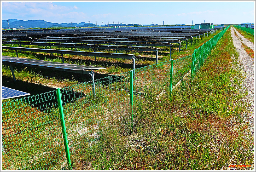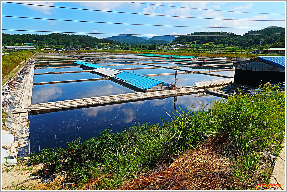 정자가 있는 곳에서 잠시 고민하다가 직진합니다. 원래 길은 좌측으로 디귿자형 방조제를 돌아 가야하지만 워낙 무더워 그냥 직진해 약 1.5km의 거리를 단축하게 되었습니다. 가는 길의 우측에는 새우양식장과 치어 종묘 배양장 있더군요. 길의 좌측에는 엄청난 규모의 태양광발전 패널이 설치되어 있습니다.