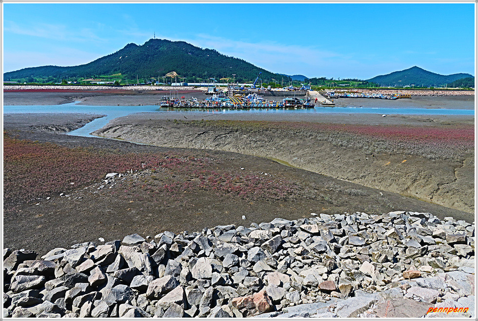 이제 설도항이 상당히 가까워 졌습니다. 방조제 안쪽에는 안강저수지가 있군요. 설도항에는 여러 척의 배들이 정박해 있는 모습니다. 영광군 염산면 봉남리 소재 설도항은 조그마한 어촌 마을의 포구(지방어항)로 염산은 소금밭 천지라는 뜻입니다. 설도는 특히 젓갈이 유명한데 영광군에서 어획되는 새우와 질 좋은 천일염을 결합하여 새우젓을 생산해 판매하고 있습니다. 이곳에는 영광수산물판매센터와 설도젓갈타운이 있어 사람들이 많이 찾습니다.