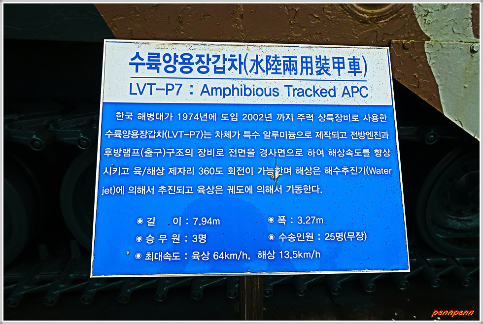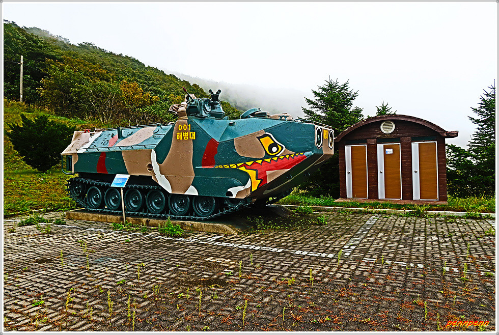 이 전투에서 국군 해병대는 제1연대의 133명이 전사하고 500여 명이 부상을 입었고, 북한군은 2개 사단에서 약 2,300 명이 사살됐습니다. 이 전투의 승리로 고(故) 이승만 대통령은 “무적해병”이라는 휘호를 하사했고, 해병대 정신의 바탕이 되었던 도솔산 전투를 기리며 “도솔산가”라는 군가가 제창되기도 했습니다. 이처럼 도솔산전투는 양구지역 일대의 38선 이북지역을 완전히 수복해 현재의 휴전선을 고착시키는 계기가 되었고, 양구군에서는 해병대 문화축제와 추모행사로 매년 6월 “도솔산지구전투 전승행사”를 개최하고 있습니다. 위령비 앞에는 해병대의 수륙양용장갑차가 전시되어 있고 그 주변에는 여러 기의 장승이 세워져 있네요.
