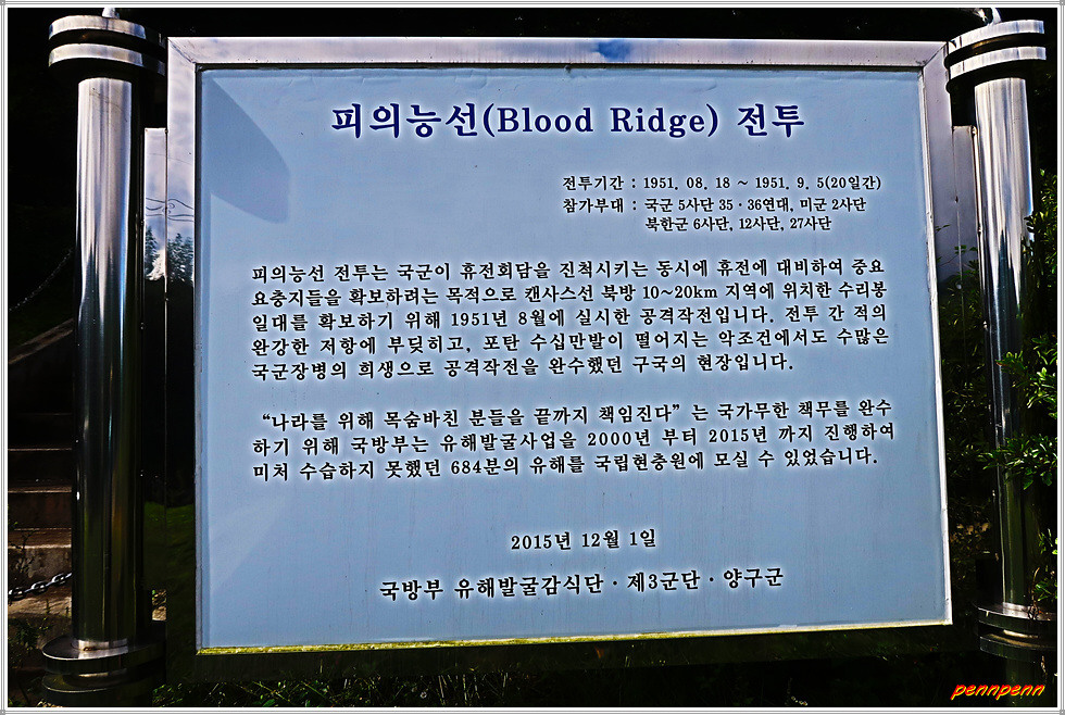 양구군 동면 월운리 소재 피의 능선 전투전적비는 한국전쟁당시 보병 제5사단 36연대가 미국 제2사단에 배속되어 북한군 제2군단 및 제5군단 예하 4개 사단과 5일간에 걸친 치열한 공방전 끝에 적군 1,480여 명 사살 및 70여명을 생포한 전투를 기념하고, 이 전투에서 희생된 장병들의 넋을 기리기 위해 세운 전적비입니다. 이 고지전으로 무수한 사상자들이 쏟은 피들이 능선을 시뻘겋게 물들이자 종군기자들이 2차 세계대전 당시 미 육군 2사단이 독일군과 맞서 싸워 비슷한 상황이 벌어졌던 지역인 피의 능선(Bloody Ridge)의 이름을 따 이곳 역시 “피의 능선”이라는 이름을 붙였습니다.