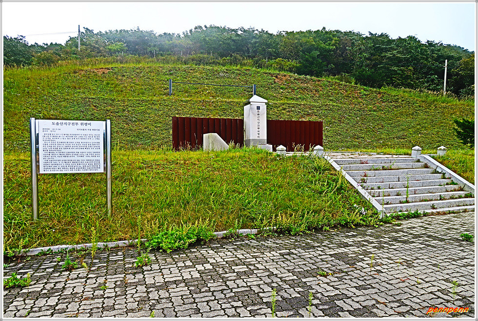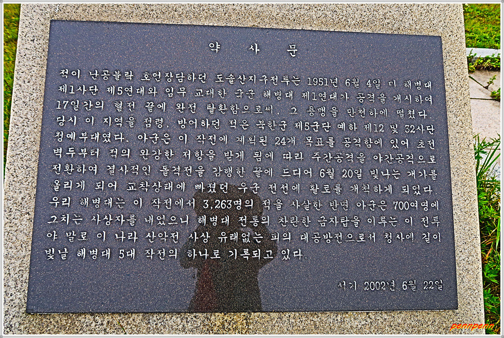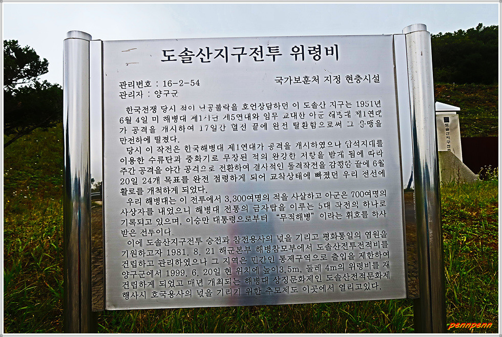 양구군 동면 비아리 소재 도솔산지구 전투위령비는 6.25 전쟁 당시 국군 해병대의 빛나는 전공을 기념하고, 도솔산지구전투에서 산화하신 호국영령을 추모하기 위해 건립한 위령비입니다. 도솔산지구전투는 한국전쟁 당시 북한군이 점령하고 있던 양구군 해안면의 도솔산(해발 1,148m)에서 1951년 6월 4일부터 국군 해병대 제1연대가 북한군 2개 사단과 치열한 공방전을 벌인 끝에 17일 만인 1951년 6월 20일 도솔산지구의 24개 고지를 모두 탈환한 전투로 도솔산지구작전이라고도 합니다.