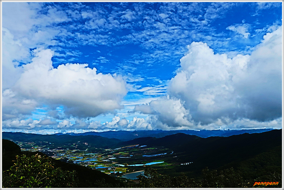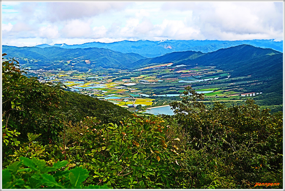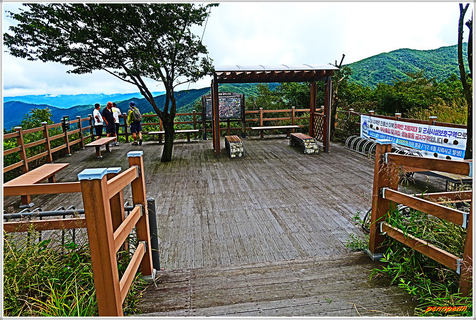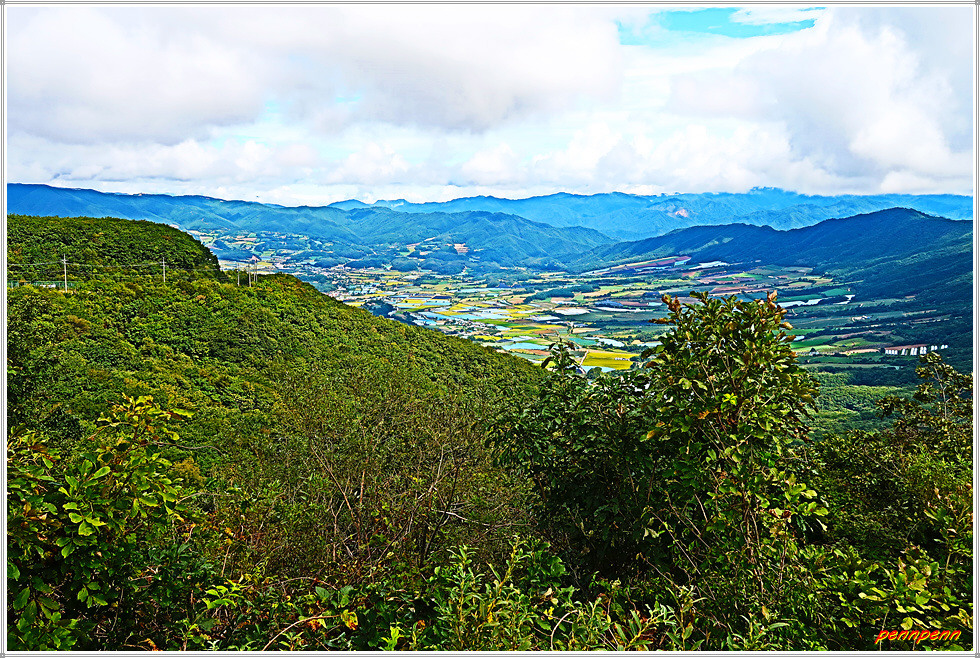 도솔암 입구와 제4땅굴 및 을지전망대 이정표를 뒤로하면 오늘의 하이라이트인 돌산령 전망대입니다. 이곳 전망대에 서면 파노라마처럼 한 눈에 내려다보이는 해안분지인 펀치볼이 절경을 이룹니다. 펀치볼 주변으로는 대암산, 도솔산 등 해발 1,100m 이상의 고봉들로 둘러싸여 있어 거대한 분지형태를 이루어 감탄이 저절로 나옵니다. 이곳에서는 도솔산과 대암산 통신철탑이 보이네요. 펀치볼(영어: Punch Bowl)마을은 양구군 해안면에 있는 침식분지로 해안분지(亥安盆地)라고도 하며, 펀치볼이라는 이름은 한국전쟁 당시 이곳에 주둔한 미군의 종군기자가 지형의 모습을 펀치를 담는 화채그릇(볼)을 뜻하는 펀치볼이라고 부른 데에서 유래했습니다.