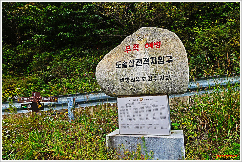 위령비를 내려와 돌산령 정상으로 갑니다. 이곳은 산림유전자원 보호지역이기도 하네요. 돌산령 포병사격훈련장 안내문을 지나는데 눈이 시릴 정도로 새파란 하늘이 여행자의 마음을 들뜨게 만듭니다. 돌산령 정상에는 해발 1,050m를 알리는 푯말이 세워져 있네요. 이웃한 산봉은 도솔산(1,148m)입니다.