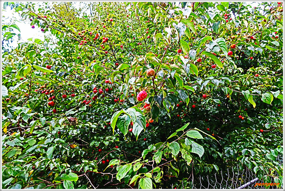 양구군 동면에서 해안면으로 가는 길은 453번 지방도로인데 돌산령 아래로 돌산령터널이 생겨 빠르게 통과할 수 있지만 평화누리 자전거길은 돌산령 터널 위 구불구불한 도로를 이용하도록 설계되어 있습니다. 도로 좌측으로 보이는 이름 모를 산의 능선에는 운무가 덮여 있군요. 길섶의 구지뽕 나무에는 열매가 주렁주렁 달려 있는 모습입니다.