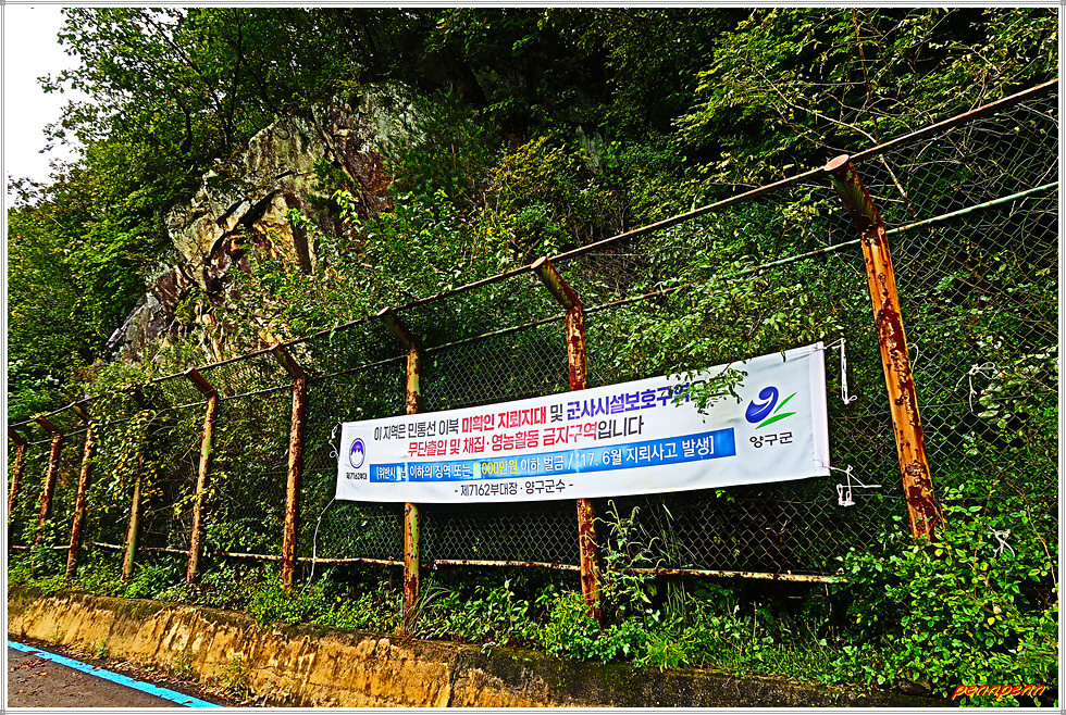 도로변 곳곳에는 철망을 넘으면 군사시설보호구역 및 미확인 지뢰지대로 무단출입 또는 영농활동을 금지하는 현수막이 붙어 있어 이곳이 접경지역임을 실감합니다. 도로변에는 쉼터가 조성되어 있어 양구군에서 자전거이용자와 보행자를 배려한 느낌입니다. 좌측으로 조망이 터지면 원래 출발지인 동면 팔랑리의 모습이 살포시 보입니다.