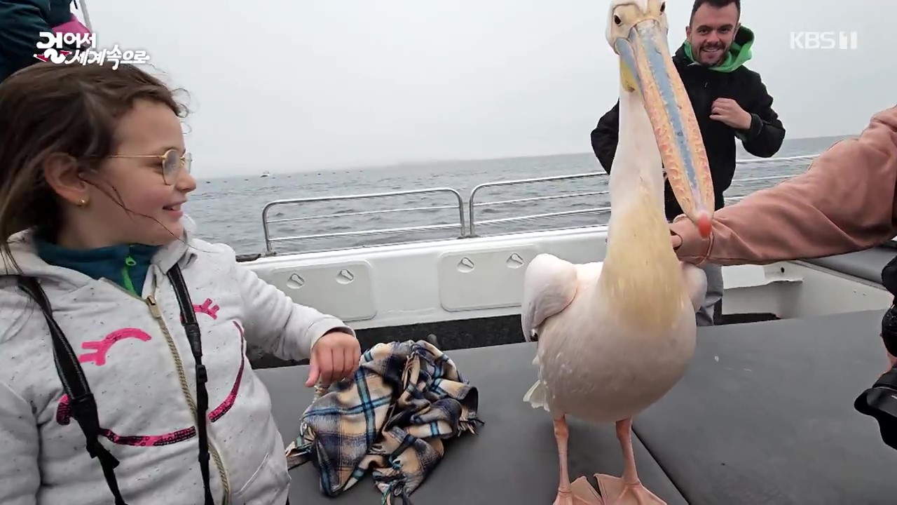 웰비스베이는 고래가 많은 도시로 선상투어(해양 돌고래 크루즈)를 떠나려는데 갑자가 물개가 갑판위로 오릅니다. 페리컨도 애완동물 같군요. 카약을 탄 사람들과 물개떼가 어우러진 모습은 보기 드문 광경입니다.