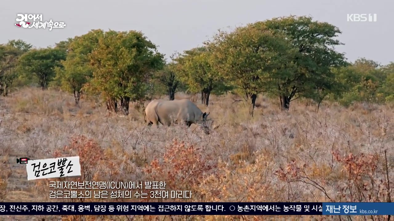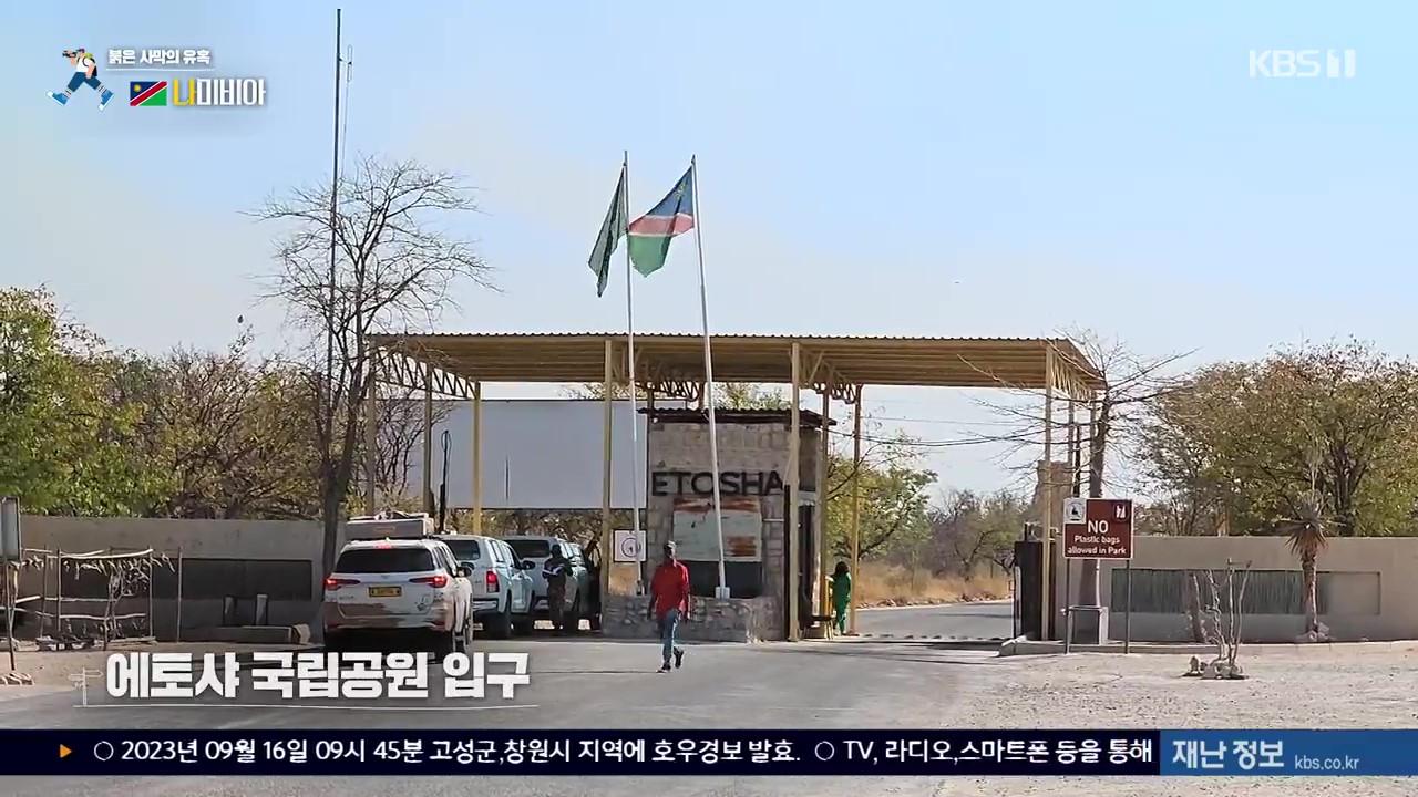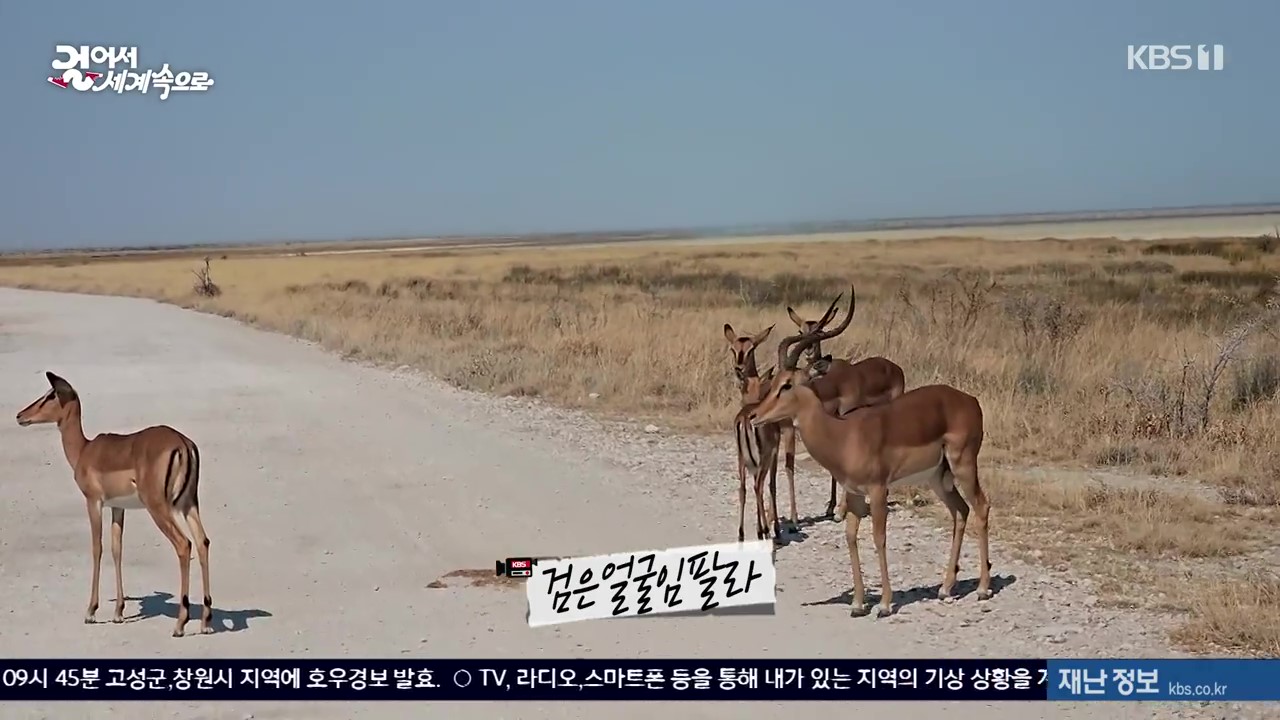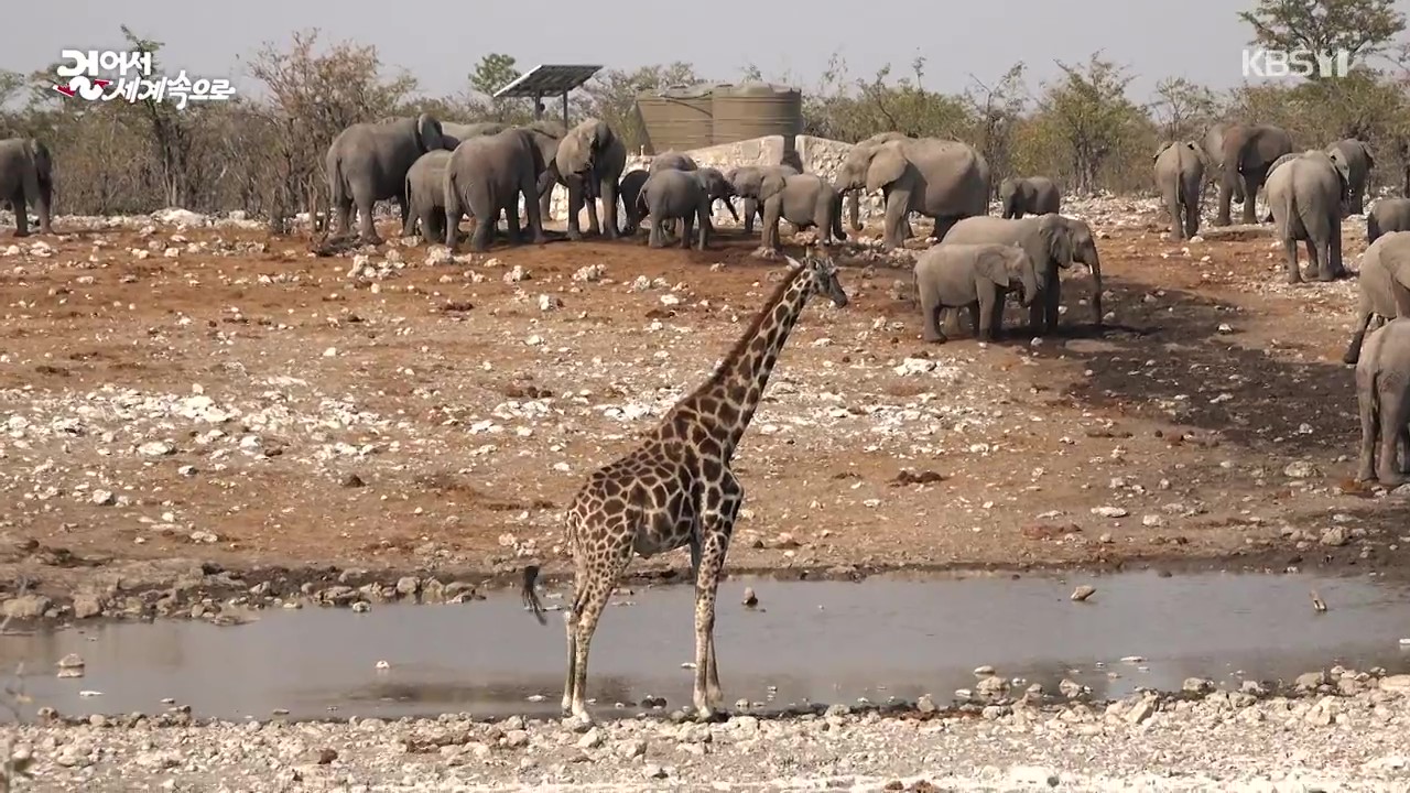 나미비아 북부의 에토사 국립공원에는 114종의 포유류와 340종의 조류가 서식하고 있는데 동물을 관찰하려면 차량을 타고 물이 있는 곳(water hole)을 찾아다녀야 합니다. 취재팀은 이곳에서 기린, 스프링복(영양), 검은얼굴 임팔라, 붉은 하테비스트, 얼룩말, 검은코뿔소, 홍학, 쿠두, 코끼리, 타조를 만났습니다. 이곳 코끼리 중 큰 것은 키가 4m, 체중은 8톤이나 된다고 하는군요.
