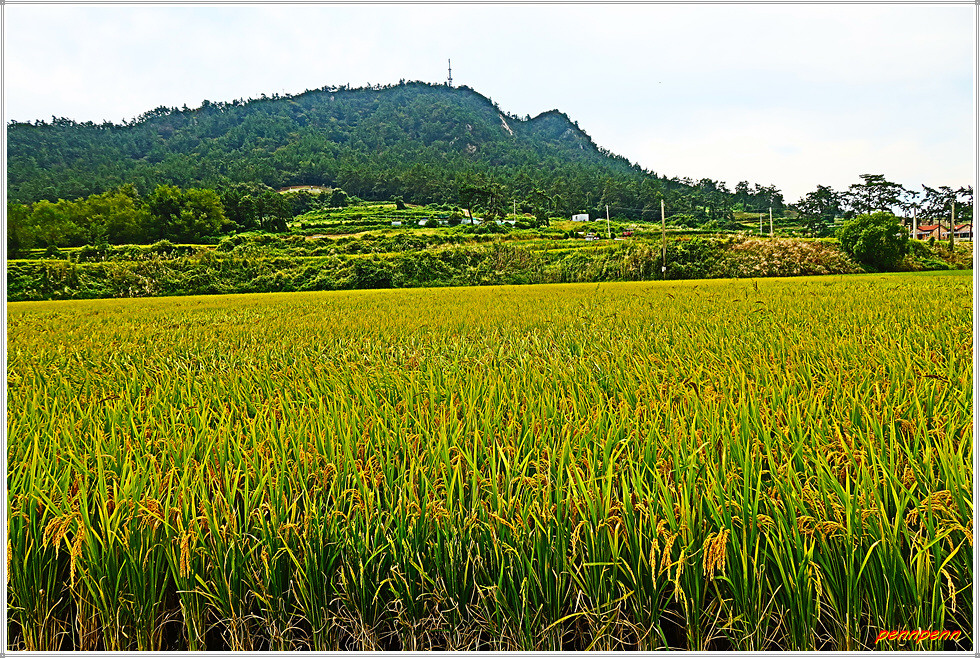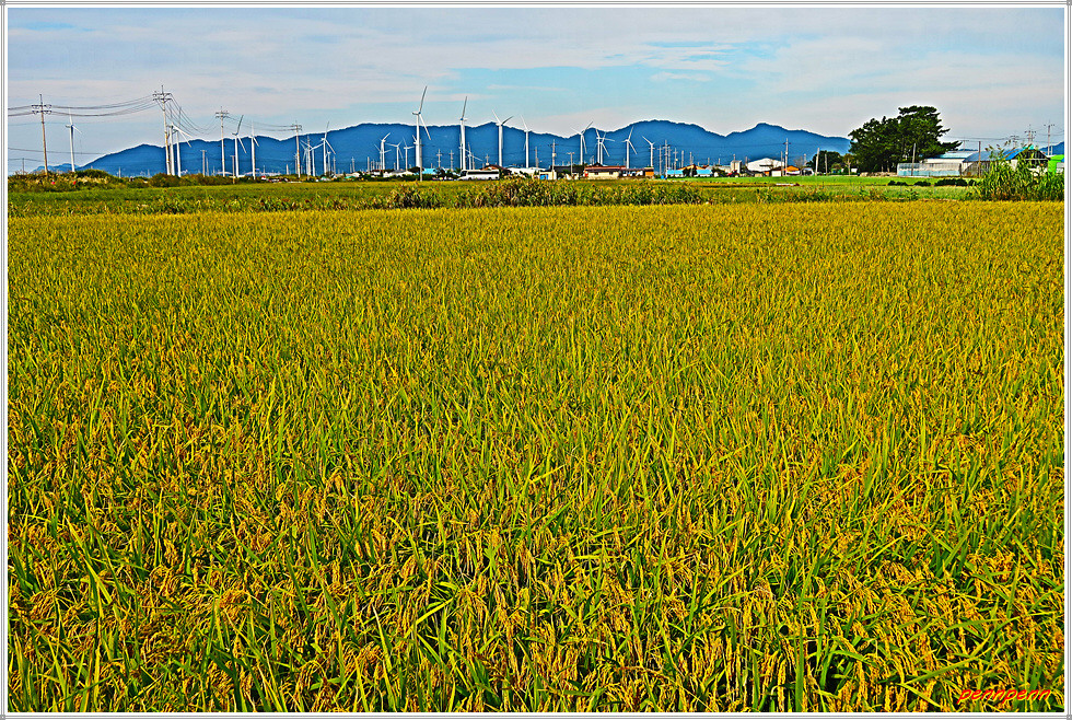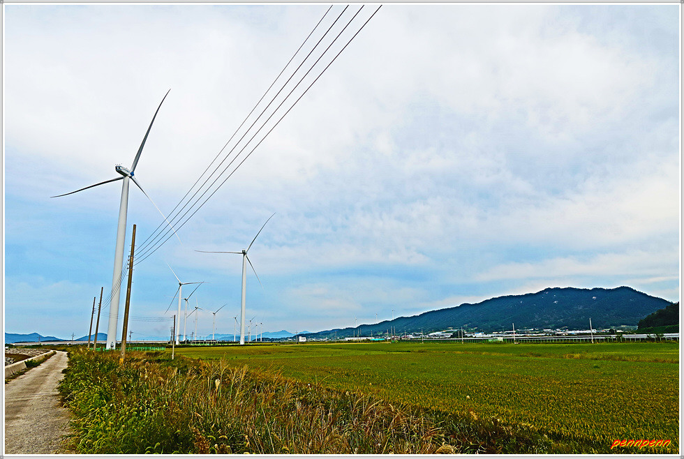 남쪽으로 깊숙하게 들어온 방조제길은 77번 국도와 만나는 지점에서 가파른 U자를 그리며 다시 북상합니다. 그런데 이번에는 방조제 안쪽에 큰 규모의 태영광발전패널단지가 있어 그 뒤로 보이는 풍력발전기와 묘한 대조를 이루는 모습입니다. 태양광발전소 옆에는 황금들녘으로 변한 벼논이 있는데 쌀의 소비가 줄어 쌀이 남아도니 이도 큰 걱정거리이지요.