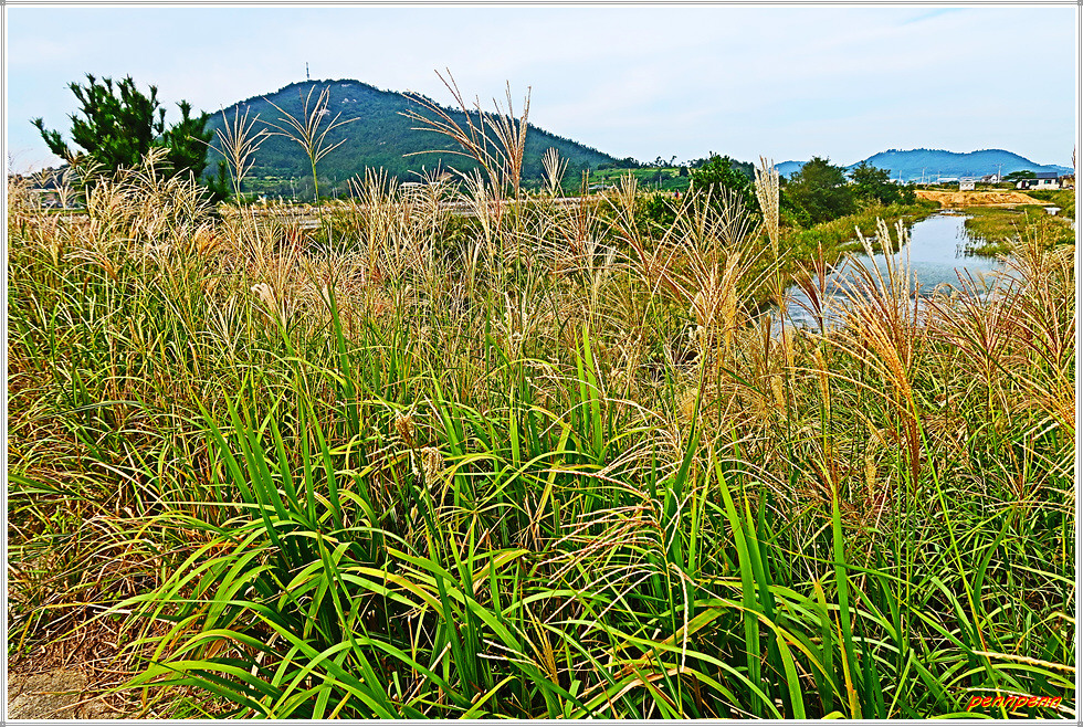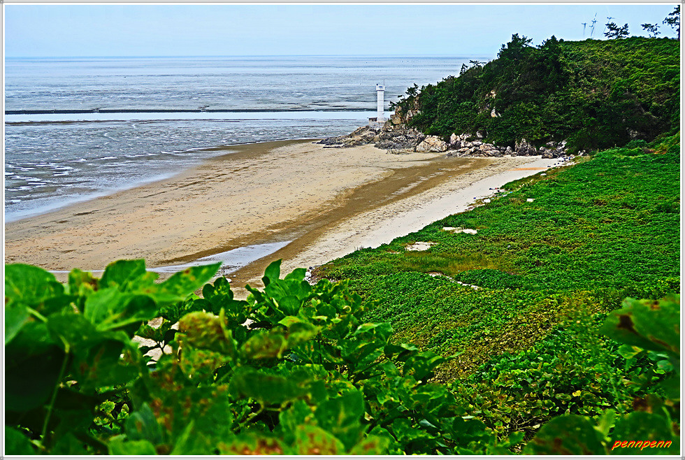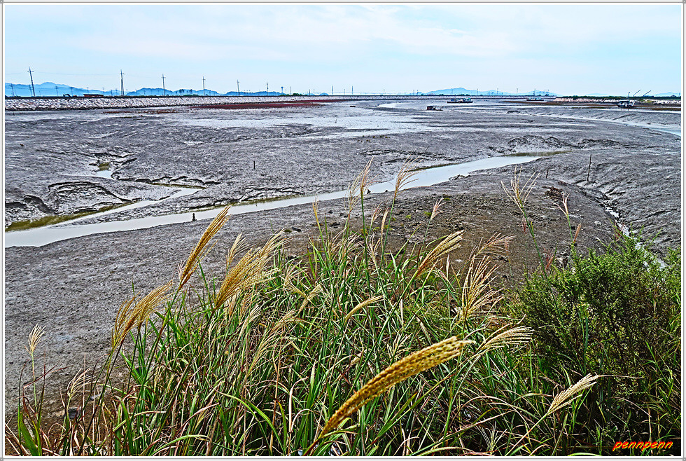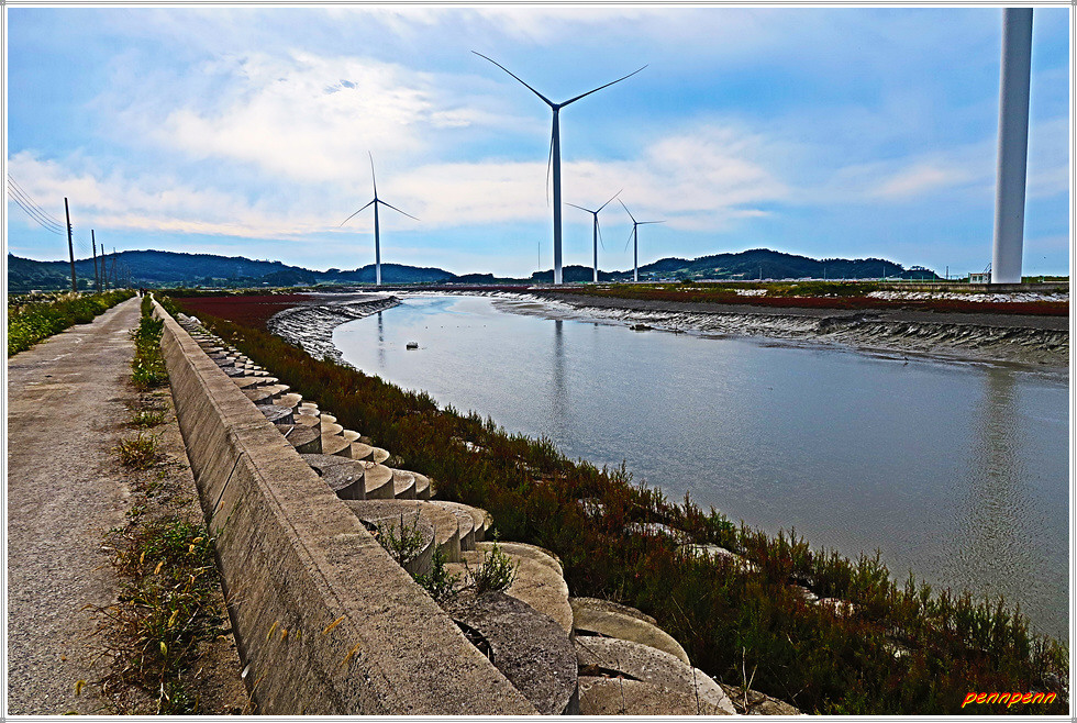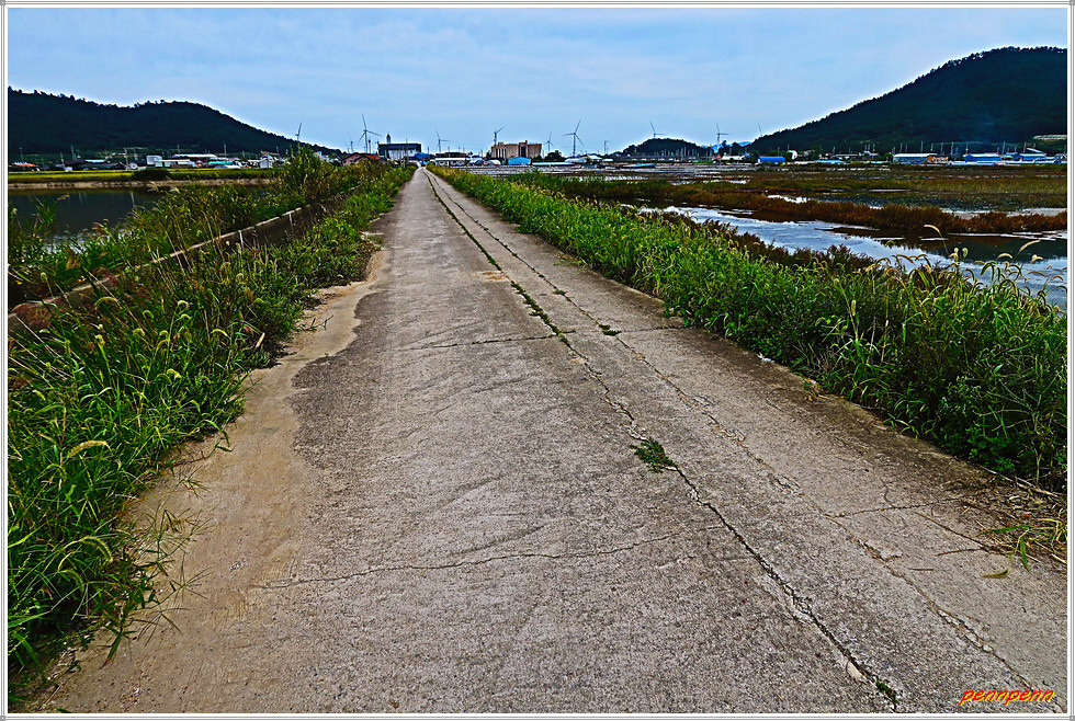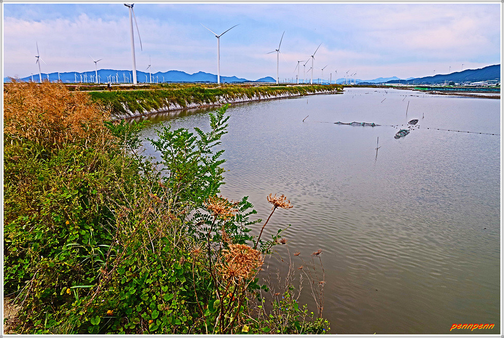 창우(昌牛)라는 이름은 마을이 푸른 칠산바다에 둘러싸여 있다하여 푸를 창(昌)자를, 마을 뒷산이 소의 형상을 닮아 한우산으로도 불려 소우(牛)를 써서 지은 것입니다. 썰물의 창우항은 참으로 한가로운 모습입니다. 서해랑길은 불갑산 하류와 염전 사이의 방조제길로 이어집니다. 제방에는 억새와 강아지풀이 피어 있는데 갯벌에는 염생식물인 칠면초가 붉은 색으로 바뀌고 있어 풍령발전기와 멋진 조화를 이룹니다.